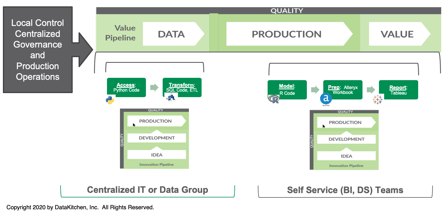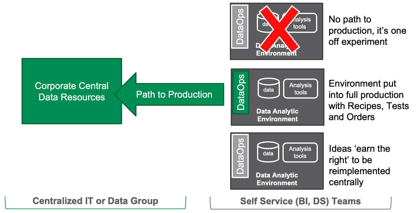 Every user sandbox is built with continuous deployment orchestrations that enable it to update a specific section of the data operations pipeline. The centralized IT and self-service teams work together yet independently. They can use different cadences and tools. They don’t have to coordinate activities – the meta-orchestration integrates their work and runs tests to ensure quality at each step of the data operations pipeline. DataOps monitors governance in the background for the respective teams.