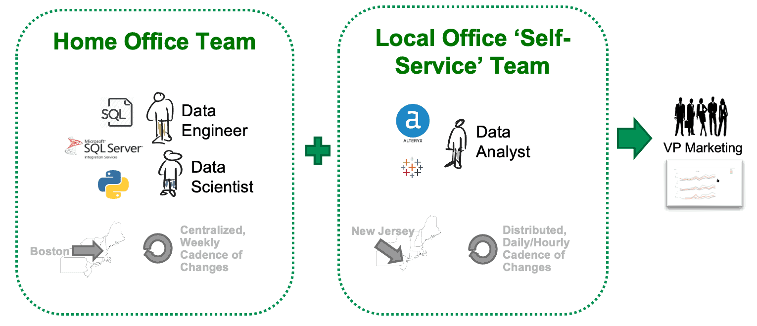 Self-service sandboxes can be used effectively to coordinate the activities of distributed groups. Figure 7 shows a multi-cloud or multi-data center pipeline with integration challenges. The home office site in Boston and the self-service site in New Jersey have different personnel, different iteration cadences, different tools and are located far away from each other. Distributed groups like these sometimes fight like warring tribes, yet, they have to provide an integrated analytics solution for the VP of Marketing.