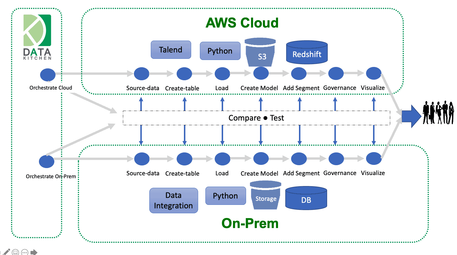 DataKitchen automates workflows that enable your data teams to collaborate more efficiently. If you have an on-prem team and a cloud team that need to stay coordinated, the groups will be able to continue making changes without interfering with each other’s productivity. Imagine that you are delivering a dashboard to the CEO. Some of it comes from the on-prem team and some from the cloud team. The teams may be in different locations with minimal communication flowing back and forth. These two teams want to work independently, but their work has to come together seamlessly. Task coordination occurs intrinsically when teams use DataKitchen, enabling the groups to strike the right balance between centralization and freedom. The figure below shows a cloud team and an on-prem team each managing their own data pipelines. DataKitchen enables each team to manage its local data pipeline and toolchain. The output of each group merges together under the control of a top-level pipeline. The model also applies to multi-cloud implementations.
