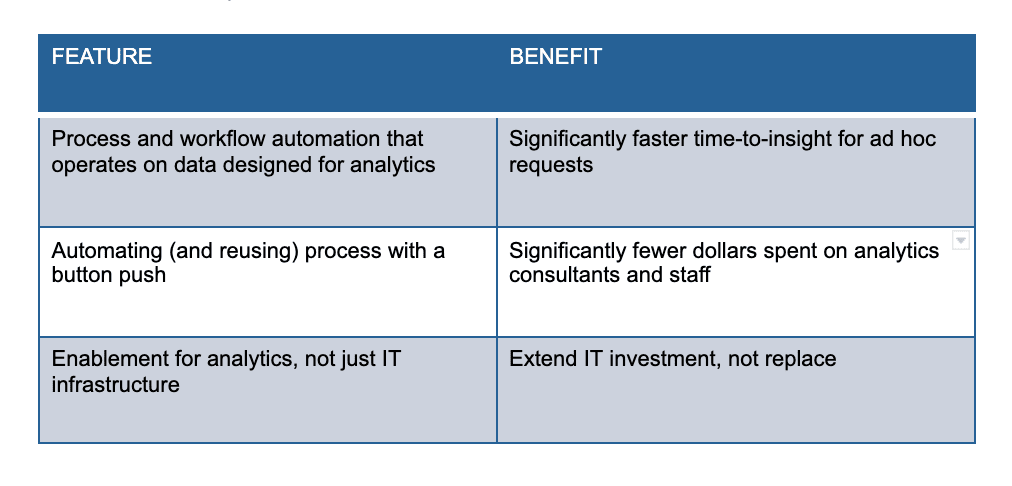 The DataKitchen DataOps Platform implements automation that replaces an army of people who previously executed manual tests, checklists and procedures. The team redeploys its newly freed resources on projects that create analytics that fulfill business requirements. The DataOps Platform allows commercial pharma analytics teams to produce more insight, faster and at the speed that the customers and business demand. Some features and benefits of the DataKitchen DataOps Platform are shown in the table below.