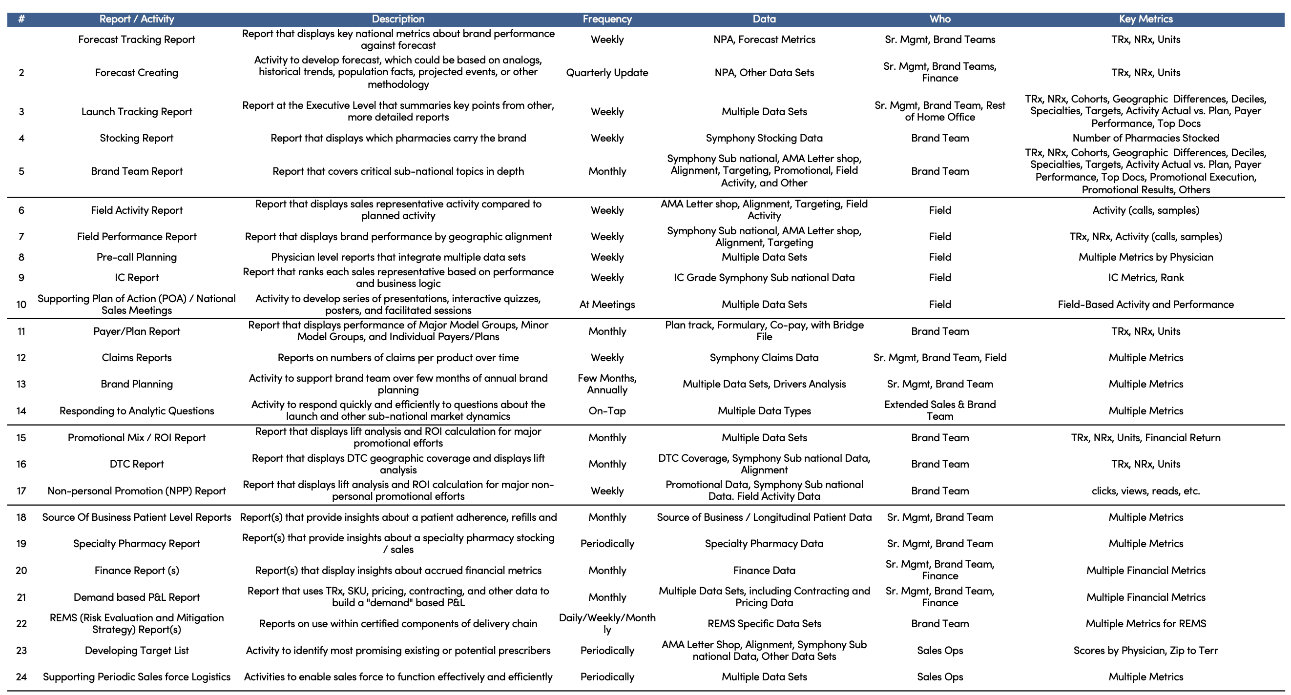Part of the data team’s job is to make sense of data from different sources and judge whether it is fit for purpose. Figure 3 shows various data sources and stakeholders for analytics, including forecasts, stocking, sales, physician, claims, payer promotion, finance and other reports.