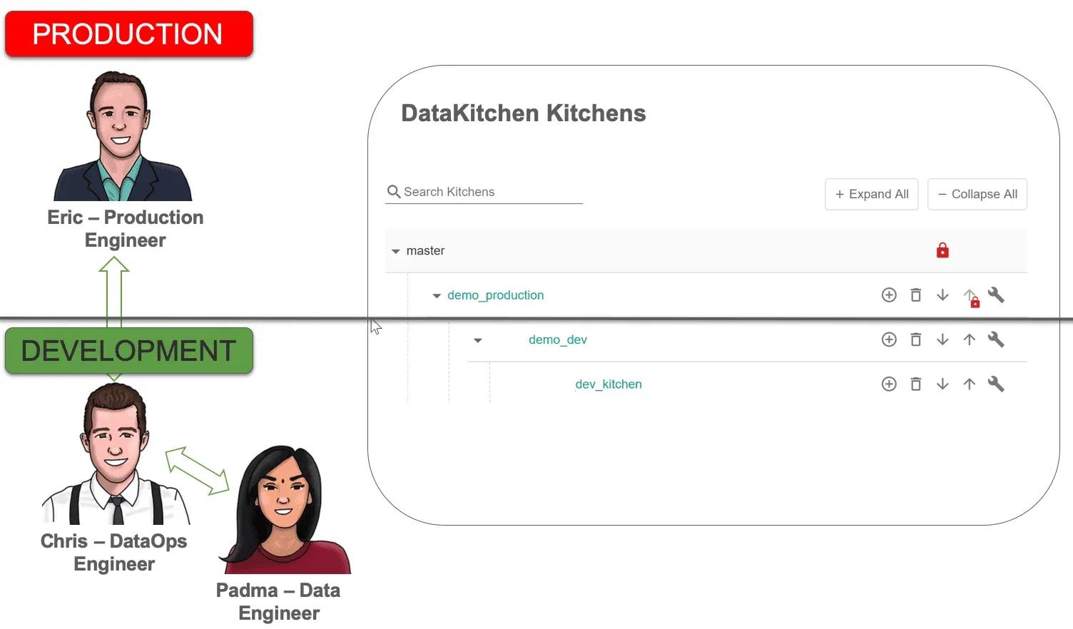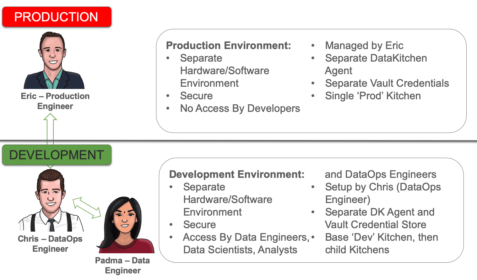 Figure 2: Production and development maintain separate but equivalent environments. The production engineer manages the production release environment and the DataOps engineer manages the development release environment.