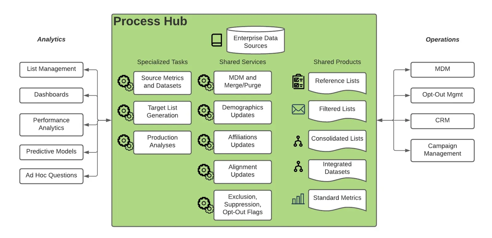 The business analysts creating analytics use the process hub to calculate metrics, segment/filter lists, perform predictive modeling, “what if” analysis and other experimentation. Requirements continually change. Data is not static. Data workflows are not like IT infrastructure that is set up and then simply maintained. New analytics are added, and existing analytics are refined. The process hub resynchronizes master data, updates demographic information and reapplies suppressions, opt-outs and other attributes.
