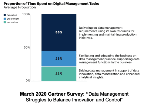 - Automate Your Data Operations and Analytics Development Pipelines – Automated orchestration will boost your team’s productivity and minimize data errors. In a recent report, IT research firm Gartner wrote that data teams are spending an average of 56% of their time manually executing and maintaining the data operations pipeline – see figure below. This is a travesty. Your data analysts and scientists are your most precious resource. You need them focused on creating new analytics that will guide the enterprise through turbulent times. Automation of the data operations pipeline and the analytics development pipeline (as in DevOps continuous deployment) will keep them away from non-value added tasks and focused on their highest priority projects.