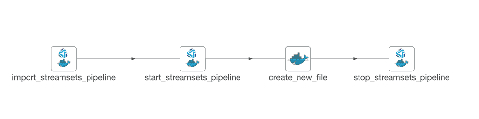 The start_streamsets_pipeline node uses a docker container to log into the AWS EC2 machine and interact with StreamSets using the StreamSets CLI to start the StreamSets pipeline.