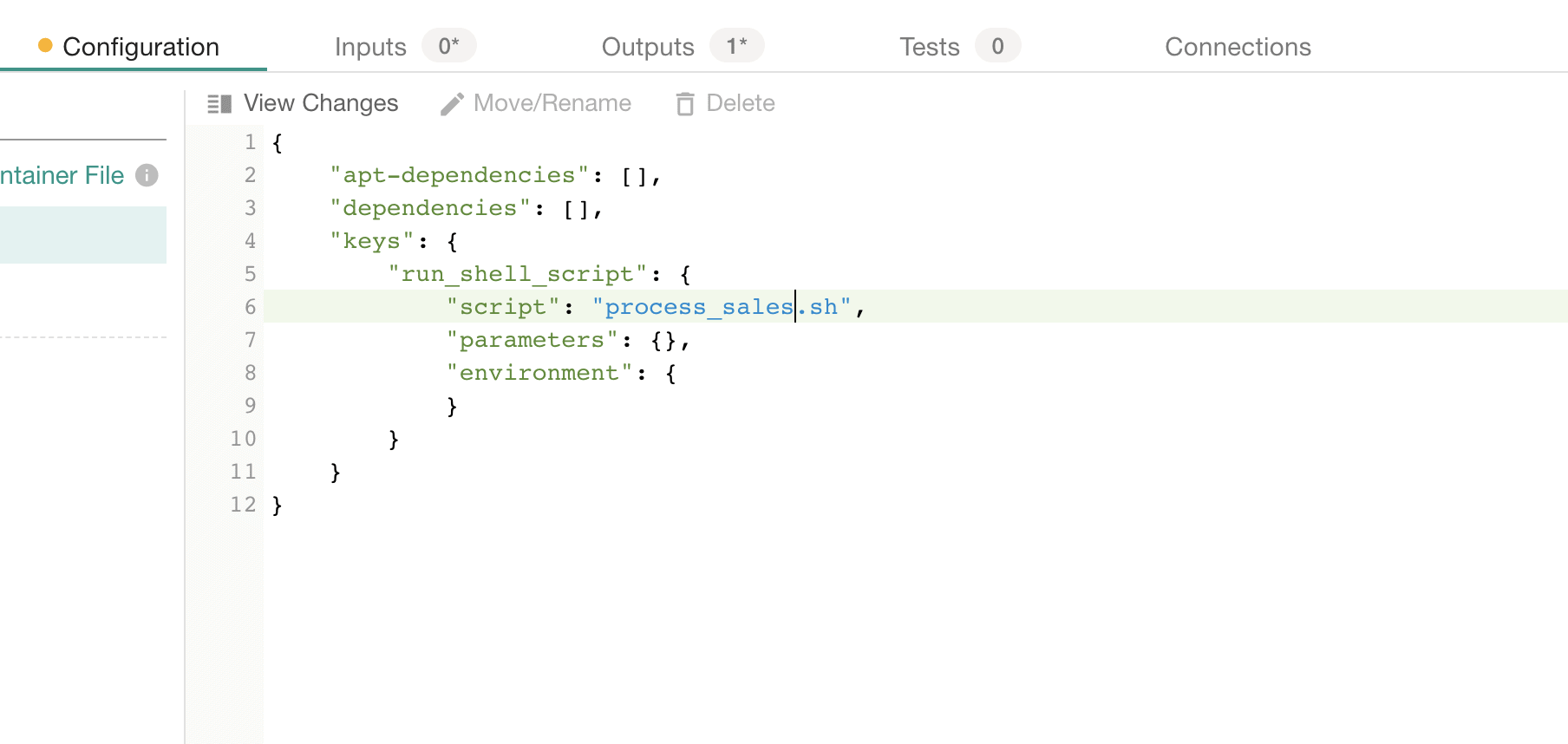 The UI makes it easy to put the shell script into a container – everything is managed by the DataKitchen Platform. This JSON configuration file tells the container to run currency_converter.sh, the file that will be run by the container.