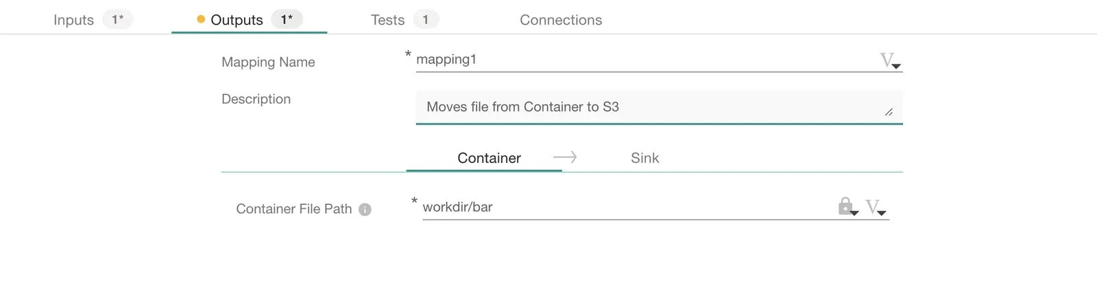 Figure 3: The DataKitchen UI enables the user to define an output sink for a container. The output tab shows the connector definition.