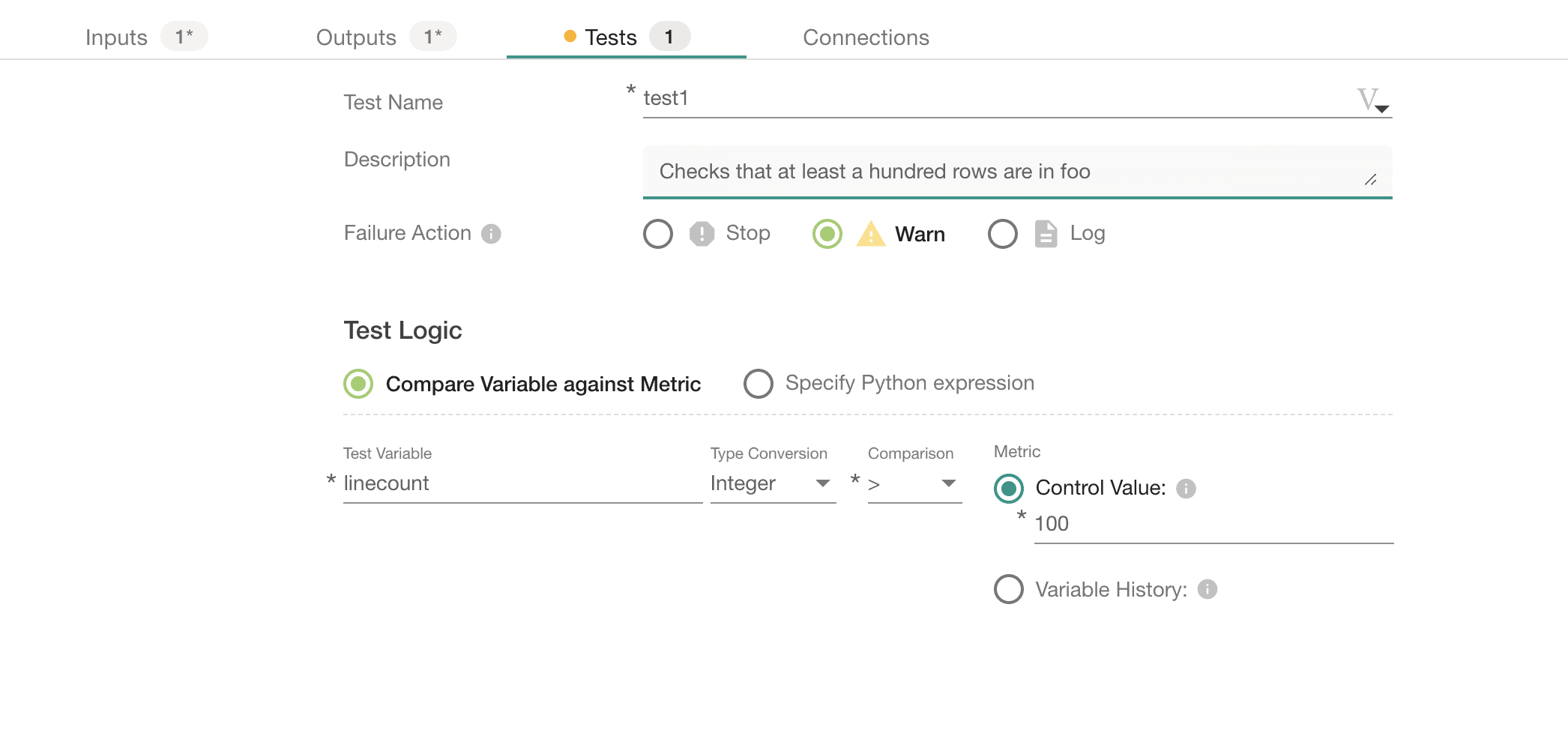 We should also test our file – this allows us to know if there were any problems. The DataKitchen Platform lets you define powerful tests using a simple UI. For example, you should check that you get an expected amount of input data and that you don’t lose rows when we transform our file. The test variable linecount represents the number of rows in the input file.