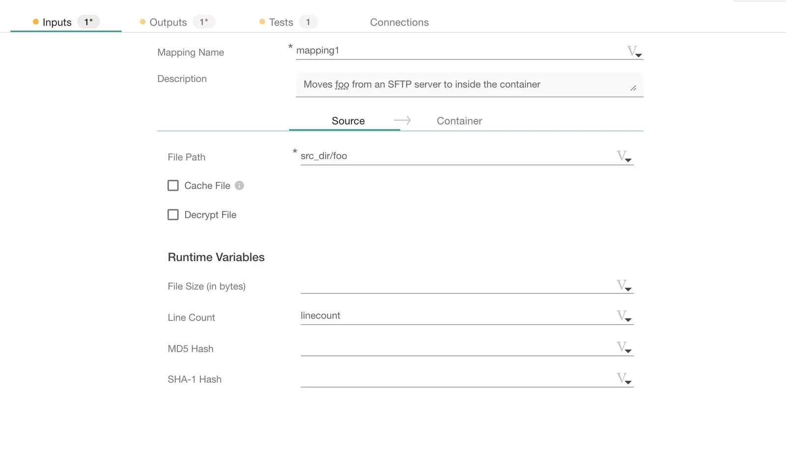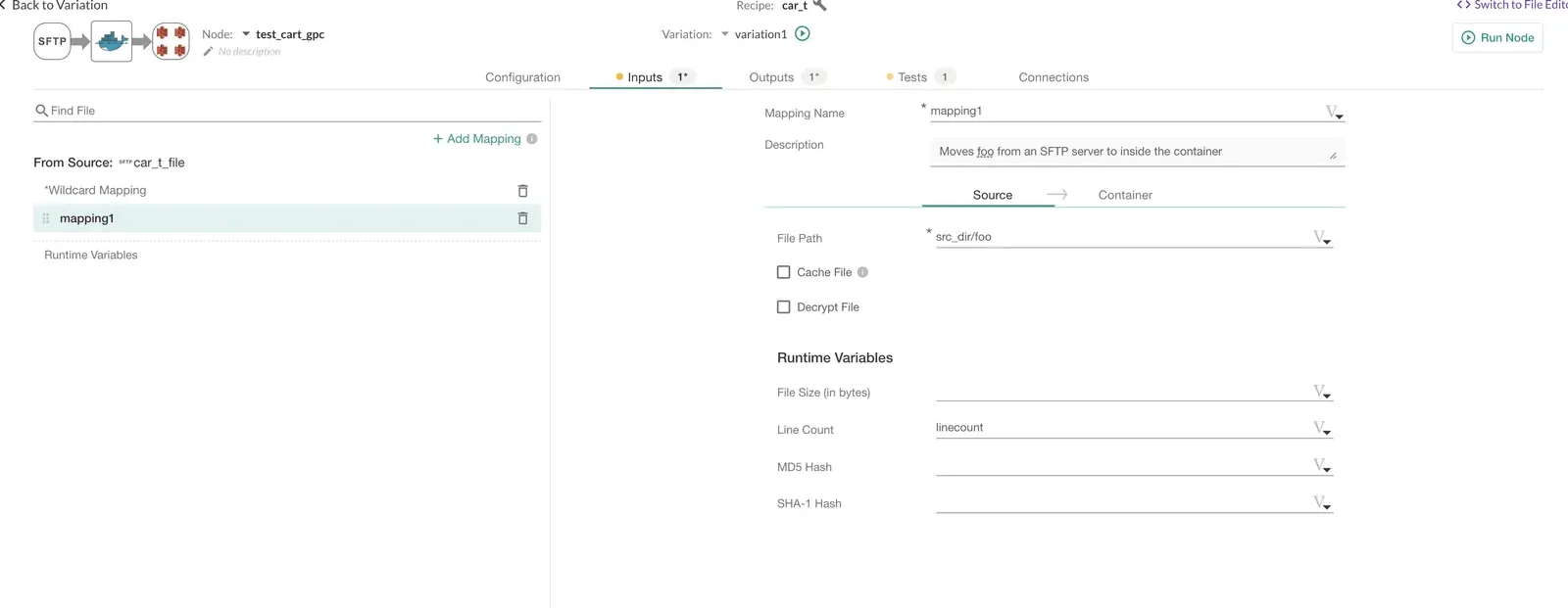 Figure 2: Using the DataKitchen UI, the user defines a source input for a container. The input tab shows the connector definition.