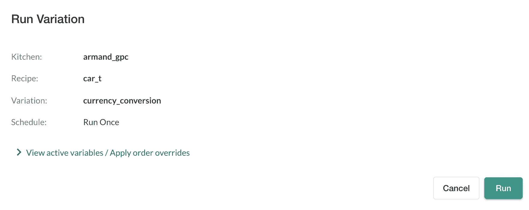 Once the container is set up, it can be run through the DataKitchen UI. Below is a screenshot showing how the order is run.