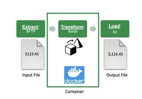 Our simple container is based on an ETL operation. The container extracts data from an input file, transforms it, and loads it to an output file. This design pattern facilitates transparency in the pipeline’s operation – it keeps the data at each stage in the ETL pipeline, easing debugging and testing.