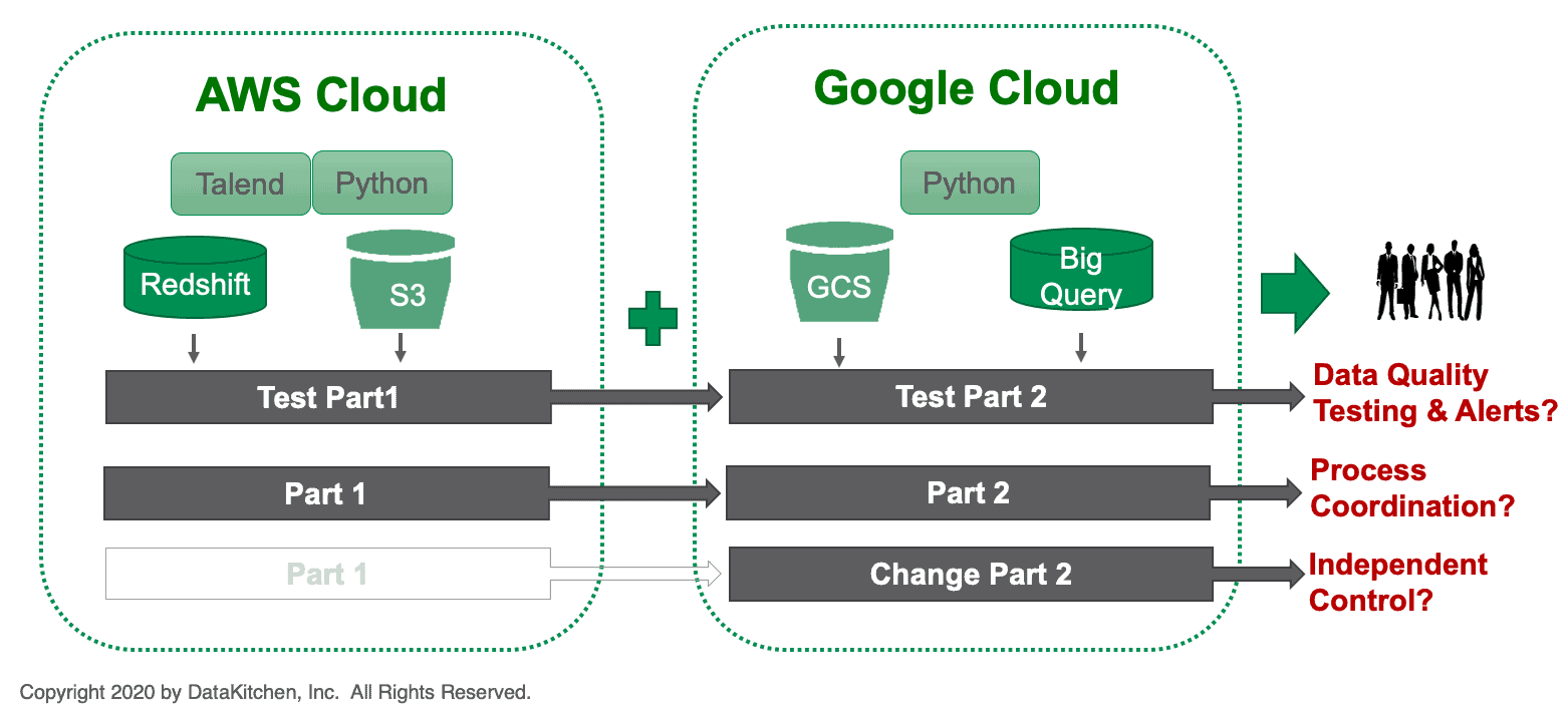 DataKitchen executes testing within each Ingredient pipeline and across the cloud environments. Once the top-level Recipe is in place it serves as a robust and modular interface between the two groups. Each group can work independently, focusing on the local call_aws and call_gcp Ingredients respectively. The two groups do not have to understand each other’s toolchain or environment. Data flowing between the two cloud platforms is compartmentalized and error-checked in the move-data and verify-move steps of the top-level Recipe.