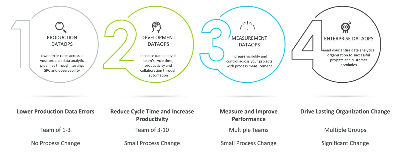 The pipelines and workflows that ingest data, process it and output charts, dashboards, or other analytics resemble a production pipeline. The execution of these pipelines is called data operations or data production. Production DataOps delivers a significant return on investment. If you have any doubt on how to get started, Production DataOps is an excellent choice because here DataOps can be implemented by a small team with no change to existing processes.
