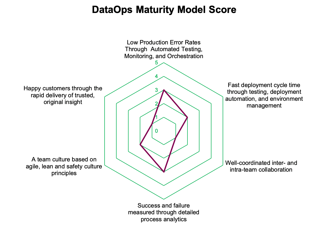 For organizations that wish to assess themselves, a DataOps Maturity Model can help them understand their strengths, weaknesses, and DataOps readiness. Maturity models are commonly used to measure an organization’s ability to continuously improve in a particular discipline. DataKitchen’s DataOps Maturity Model outlines a measurement approach for building, monitoring, and deploying data and analytics according to DataOps principles. With this model, teams can understand where they are today and how to move up the curve of DataOps excellence. Figure 8 shows an example Maturity Model result.