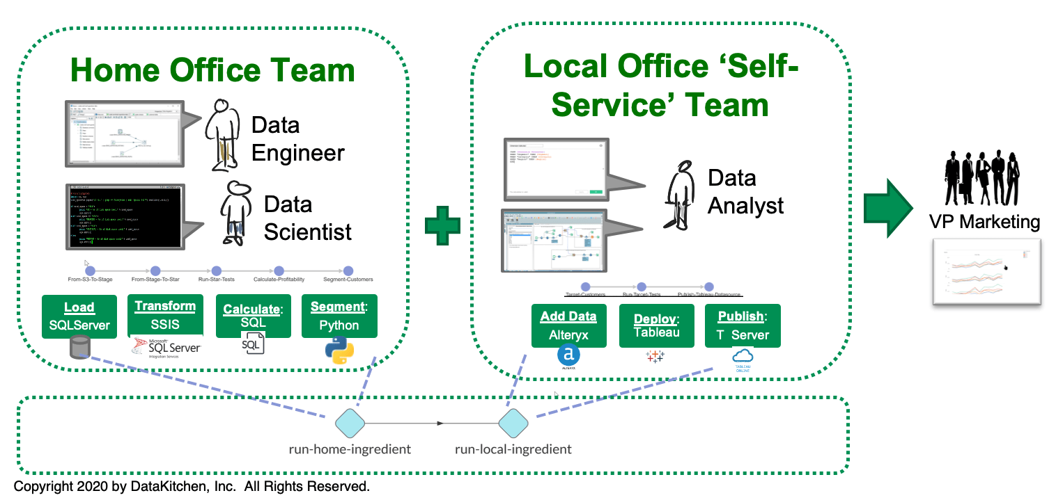 The highest meta-orchestration is the top-level pipeline (run-home-ingredient and run-local-ingredient) – perhaps managed by a centralized IT organization – also orchestrated by DataKitchen software. The local teams don’t have to understand the meta-orchestration or the toolchain of the other office. If any part of a local orchestration or meta-orchestrations fails a test, the group responsible is notified and can address it.