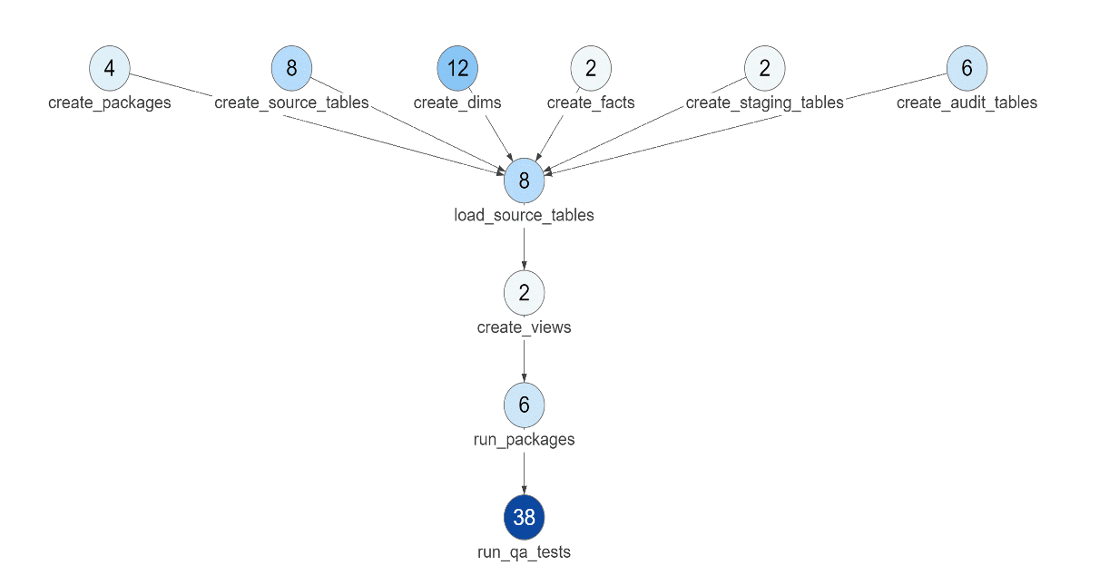 Figure 3: DataKitchen makes it easy for the data team to integrate testing and monitoring into production orchestrations. The above view of a data pipeline shows the number of tests at each stage of processing.