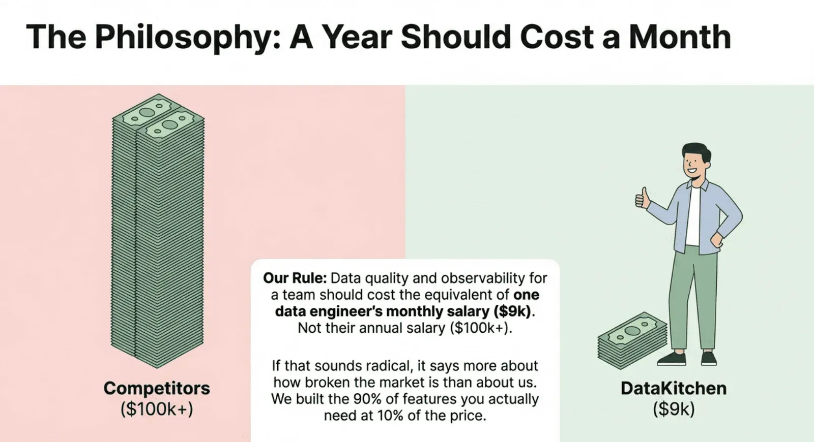 Here’s what we believe: data quality and observability for a small team for an entire year should cost the equivalent of one data engineer’s monthly salary.
