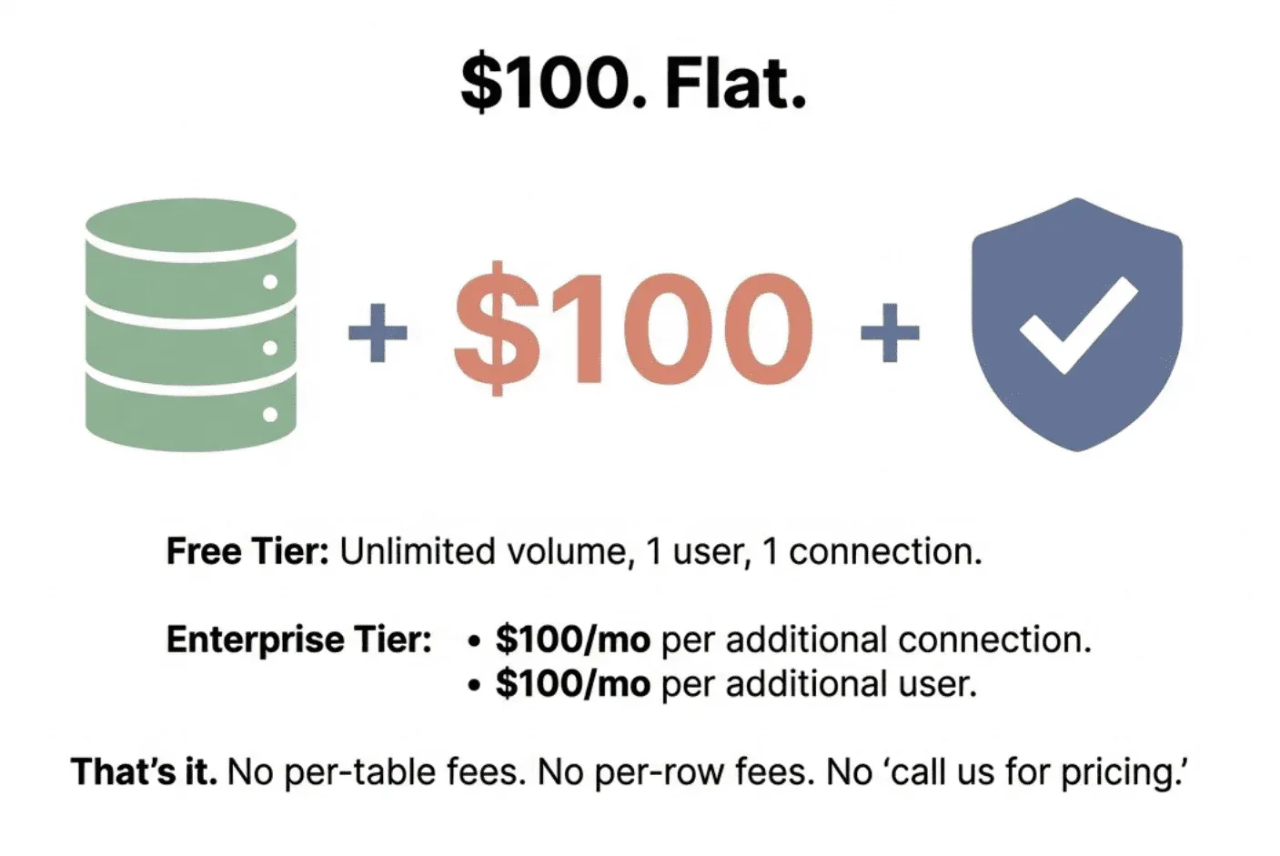 That’s it. No per-table fees. No per-row fees. No credits that run out at the worst possible time. No “let’s schedule a call to discuss pricing.”