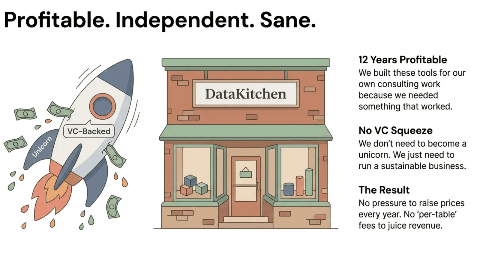 Buy from a profitable, independent company. Don’t pay the “VC squeeze.” We’ve been profitable for 12 years. We built our tools from the profits of our data engineering consulting work because we needed something that actually worked. We don’t have venture investors demanding growth at all costs, so there’s no pressure to raise prices every year.