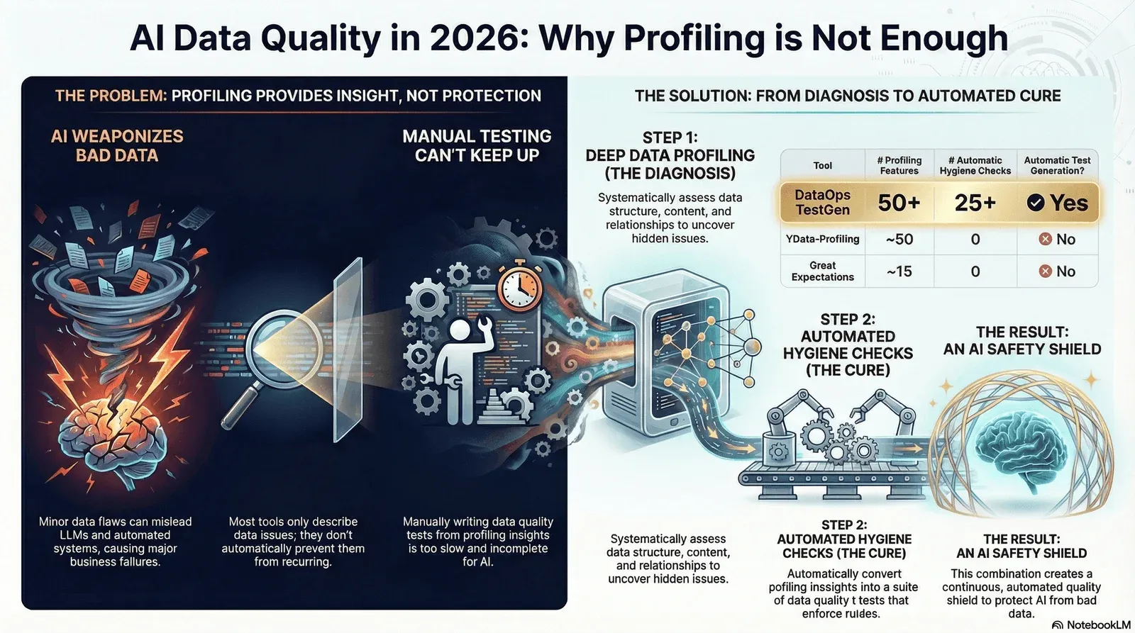 In 2026, data quality has become a matter of AI, decision, and business integrity. Open-source profiling tools remain essential for visibility, but visibility without action is no longer enough. Only DataOps Data Quality TestGen turns profiling into automated enforcement, creating the guardrails required to operate safely in an AI-driven world.