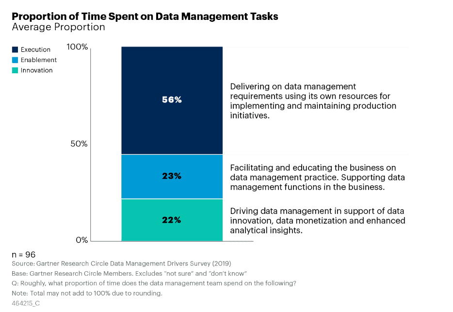 In a recent Gartner survey (figure 1), data professionals spent 56% of their time on operational execution and only 22% of their time on innovation that delivers value. An effective DataOps strategy can help a team invert this ratio and provide more value to the company.