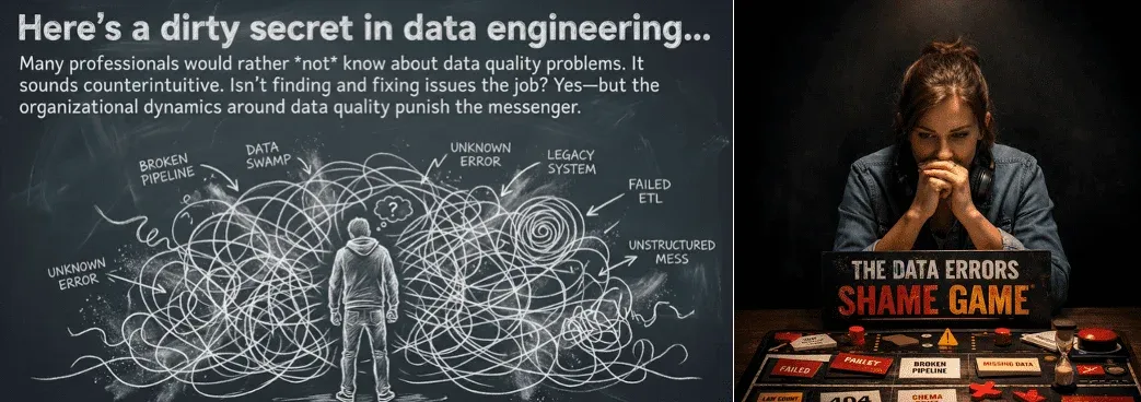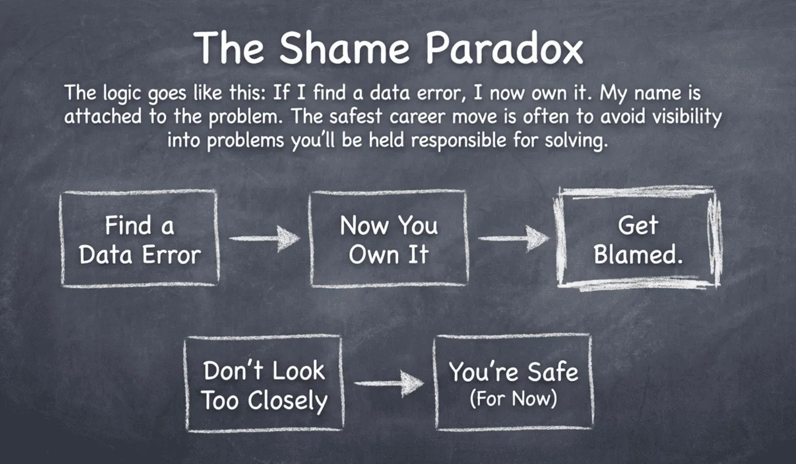 This shame creates a strange and painful paradox. The very people best positioned to catch data quality issues — the data engineers closest to the pipelines — often develop an unspoken preference not to look too closely. Not because they don’t care, but because they’ve learned that discovering a problem means owning the blame for it.