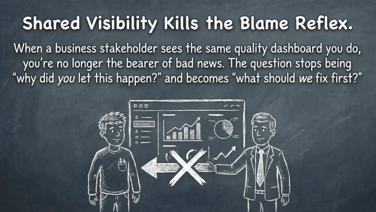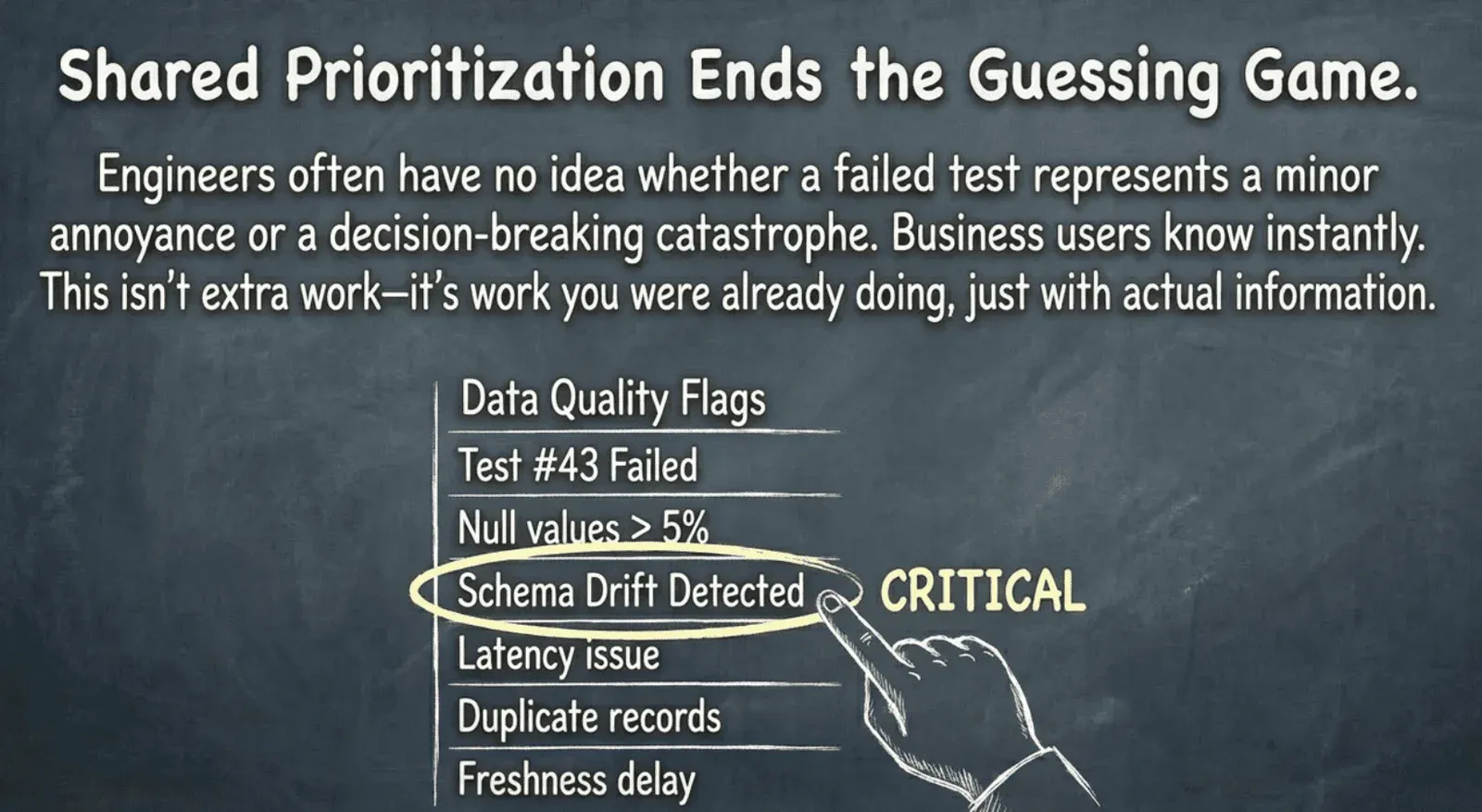 When data engineers and business users look at quality problems together, something remarkable happens. The engineer is no longer the sole bearer of bad news, nervously presenting failures to stakeholders who’ve been kept in the dark. Instead, everyone is looking at the same reality at the same time. The dynamic shifts from “what did you miss?” to “what should we tackle first?”
