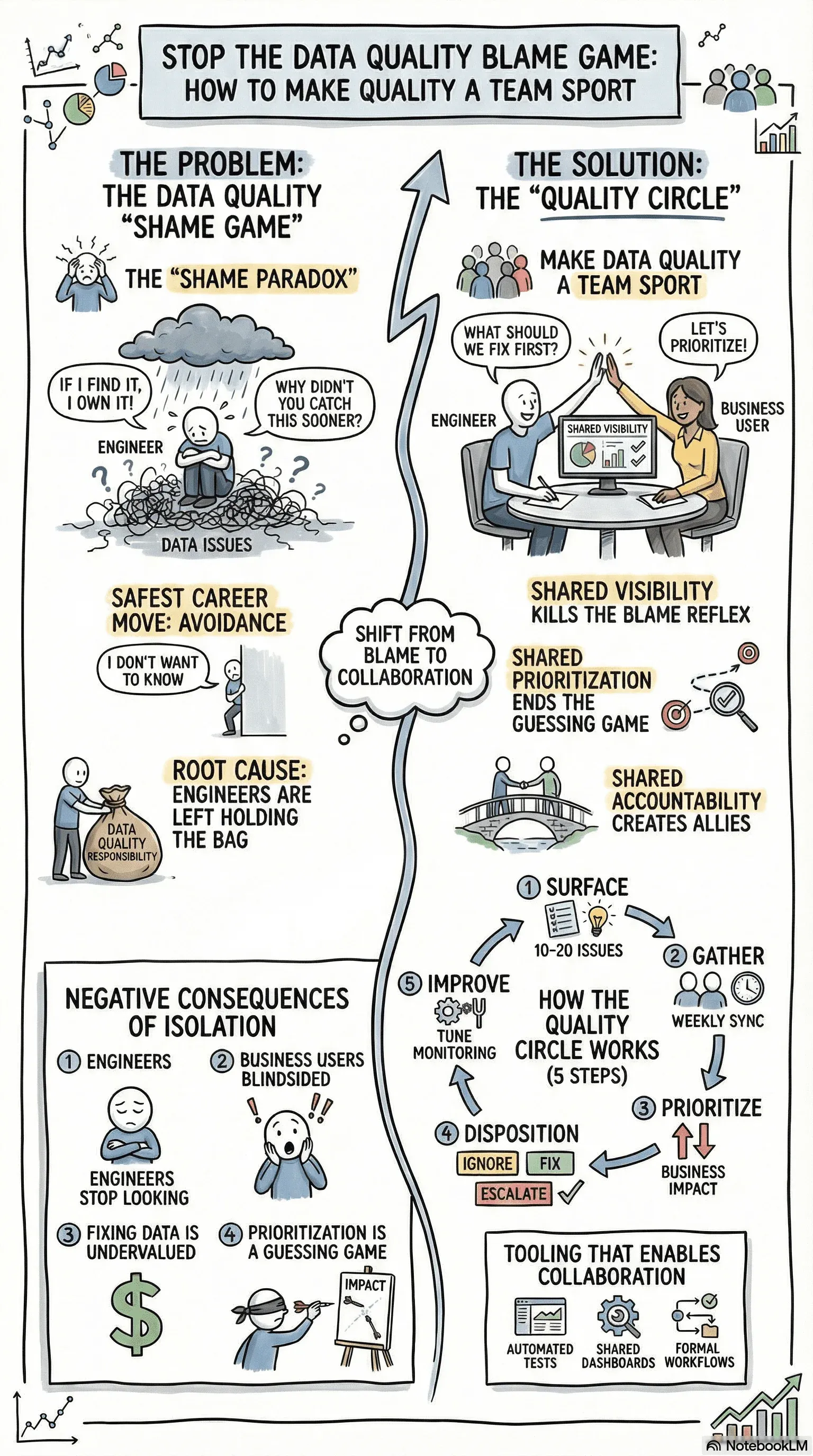 The antidote is simple in concept and profound in effect: stop hiding the problems, and stop facing them alone. When you build a quality circle that includes both the people who build the data systems and the people who depend on them, you replace shame with solidarity. You replace defensiveness with curiosity. You replace the exhausting performance of perfection with the honest, hopeful work of continuous improvement.