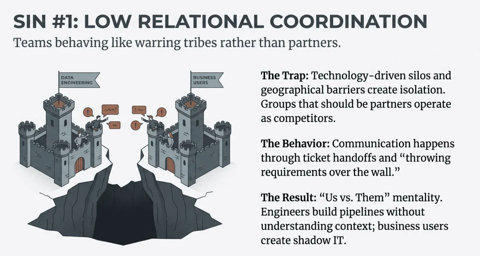 Organizational sins are more challenging to diagnose and even more complex to fix because they are baked into the culture, the incentive structures, and the operating models that everyone takes for granted. These are the systemic dysfunctions that turn talented individuals into ineffective teams and promising initiatives into expensive disappointments. In this follow-up post, we examine five organizational sins that plague data teams: low relational coordination, blame culture, data blindness, project thinking, and lack of process curation. Recognizing these patterns is the first step toward building data organizations that actually work.