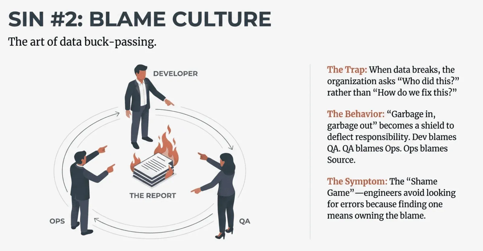 This blame culture is not just demoralizing; it is organizationally corrosive. When people fear being blamed for problems, they stop looking for problems. They push untested code to production because once it is deployed, someone else becomes responsible. They craft emails that document decisions in ways designed to deflect future accountability rather than facilitate current collaboration. The energy that should flow into fixing root causes instead flows into constructing elaborate defenses. Breaking this cycle requires shared visibility into data pipelines, clear ownership models, and a cultural shift from “who broke it” to “how do we prevent it from breaking again.” Until organizations address the blame game directly, they will continue playing it.