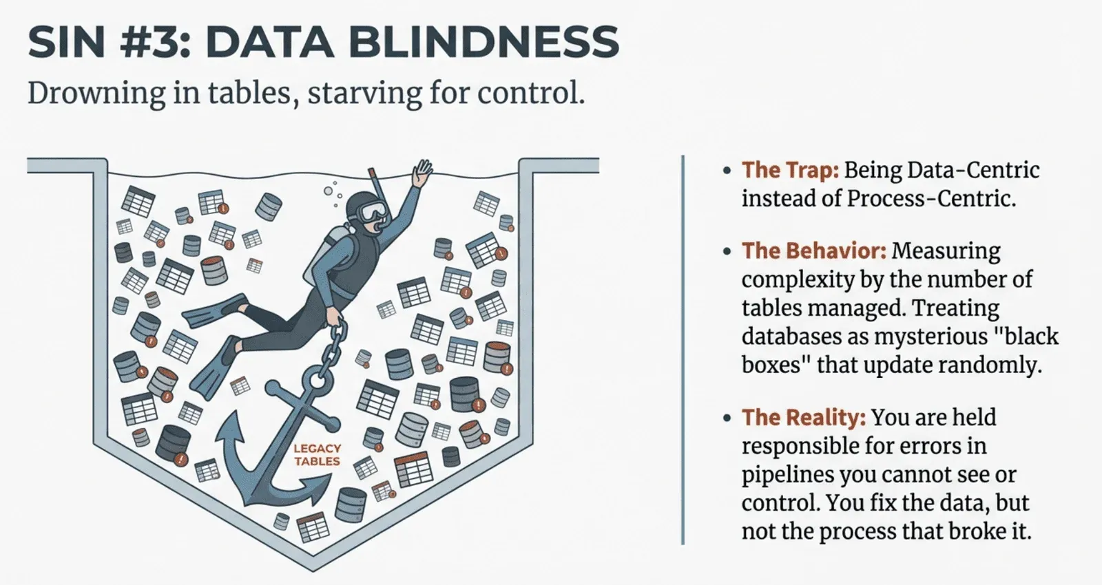 The Problem: Most teams are data-centric, viewing complexity as the number of tables they manage. They treat databases like “black boxes” full of tables updated by mysterious processes they do not control.