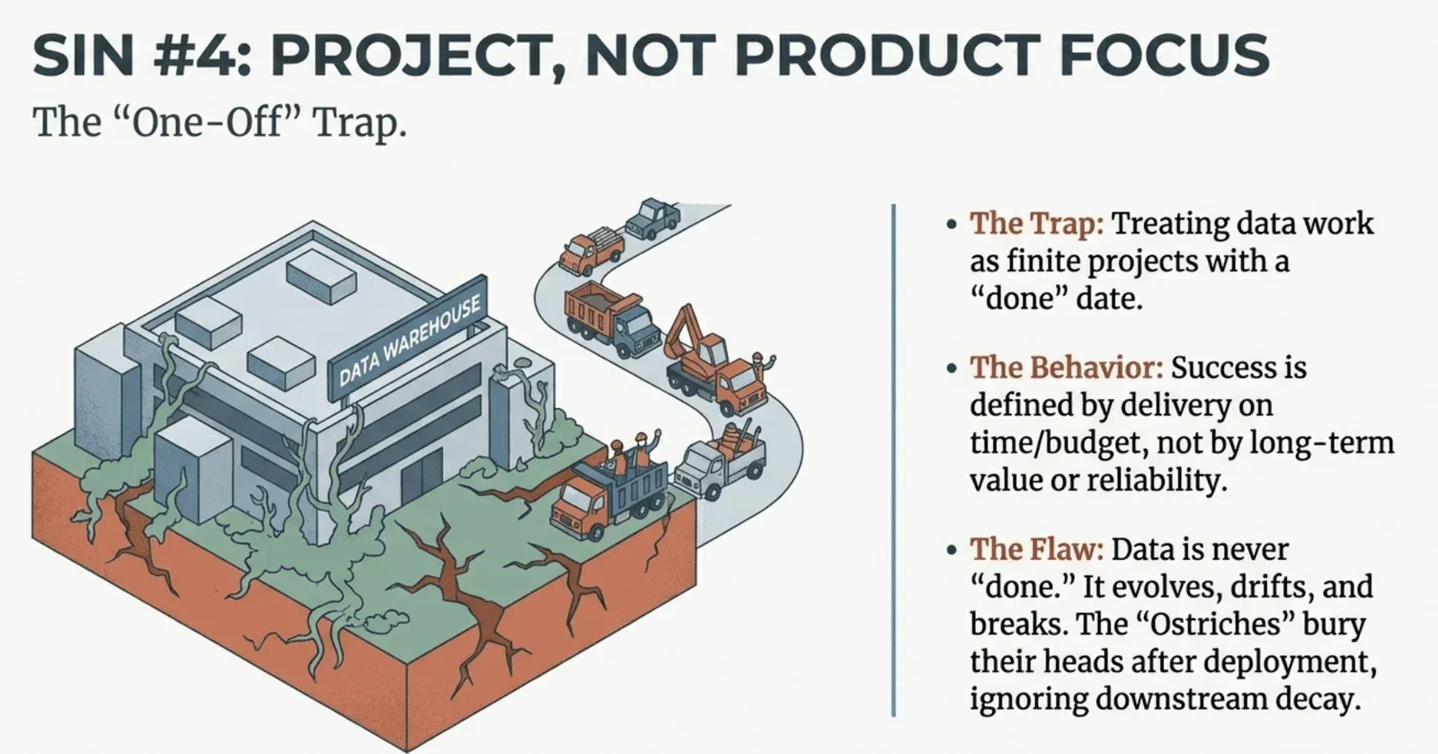 This sin involves treating data assets as one-off deliverables rather than evolving products.