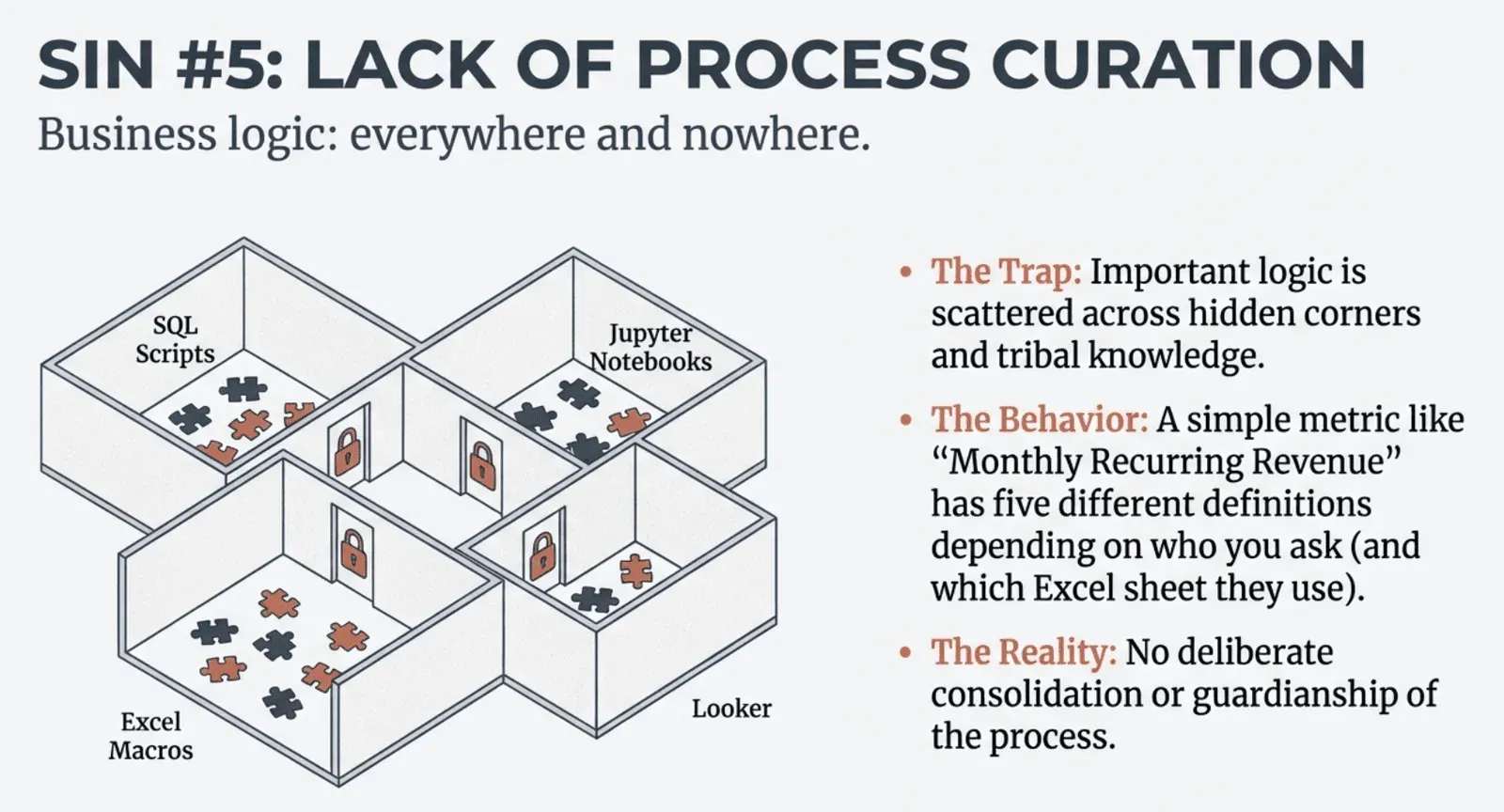 There is a quiet crisis happening in data organizations everywhere. It occurs when brilliant analysts independently solve the same problem in three different ways, when data scientists struggle to reproduce each other’s work, and when a single “simple” metric like Monthly Recurring Revenue has five competing definitions scattered across the organization. As detailed in Process Guardianship: The Most Valuable Data Engineering Work You’re Probably Not Doing, the absence of deliberate process curation means that business logic lives everywhere and nowhere. Metrics, models, calculations, and code are scattered across SQL scripts, Jupyter notebooks, Looker reports, Python models, and Excel macros, with no one taking responsibility for consolidating them into a unified, tested, production-grade system.