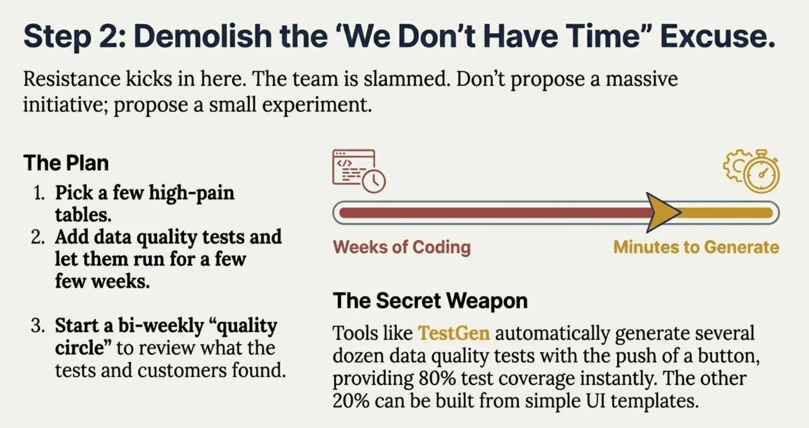 Data quality testing doesn’t have to be a time sink. Tools like TestGen can auto-generate 80% of the needed test coverage in minutes, not weeks. The “we don’t have time” objection evaporates when you can run a small experiment on a few problem tables rather than launch a massive initiative.