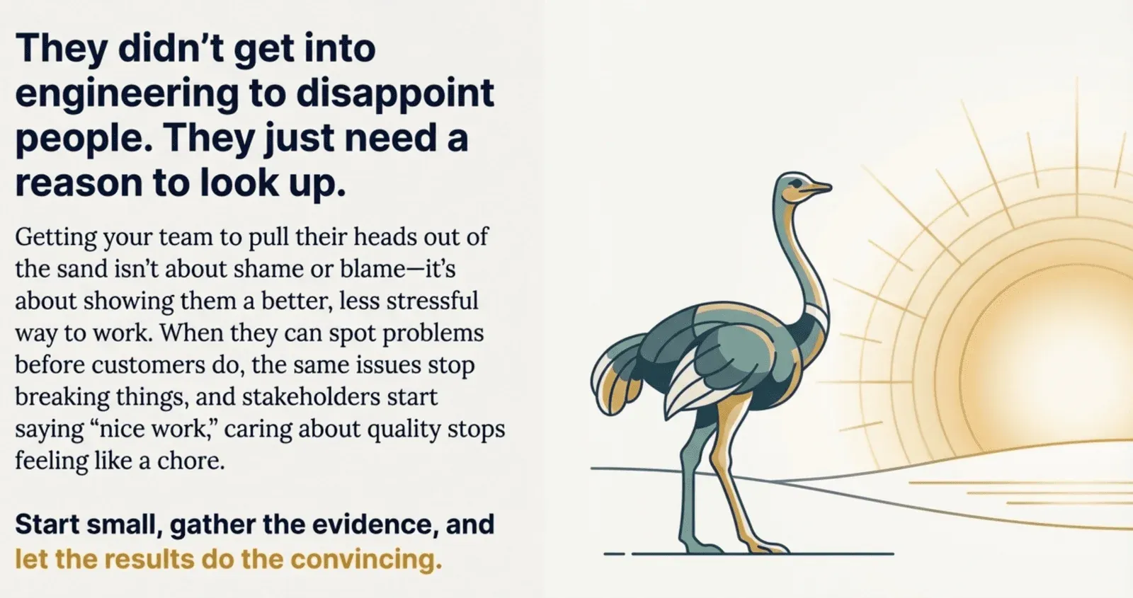 Getting your team to pull their heads out of the sand isn’t about shame or blame—it’s about showing them there’s a better way. When they can spot data problems before customers do, when the same issues stop breaking things week after week, and when those dreaded stakeholder calls turn into the occasional “hey, nice work”—suddenly, caring about production quality doesn’t feel like a burden anymore. It feels like the thing that makes their jobs less stressful.