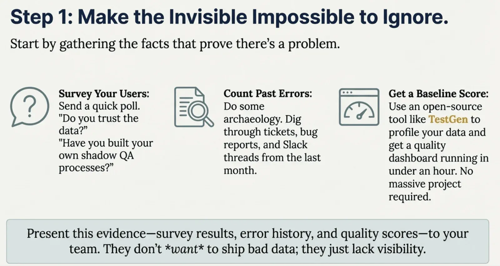 Make the problem undeniable. Gather evidence your team can’t ignore—survey end users about their trust in the data, count recent data errors from tickets and Slack threads, and use a tool like TestGen to score your data quality and generate a dashboard instantly. Share the results. Most engineers will be surprised.