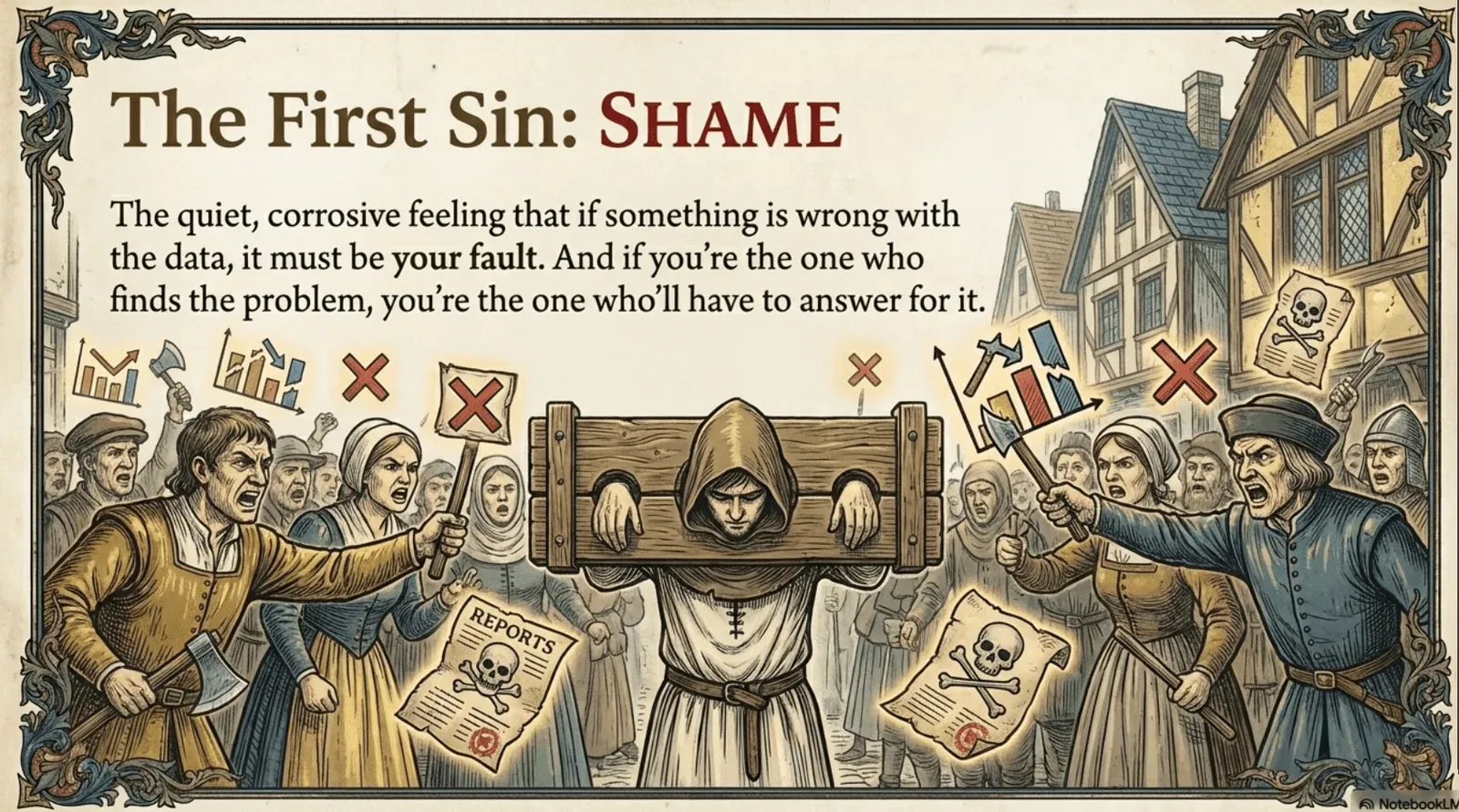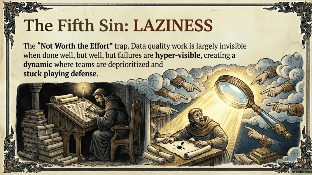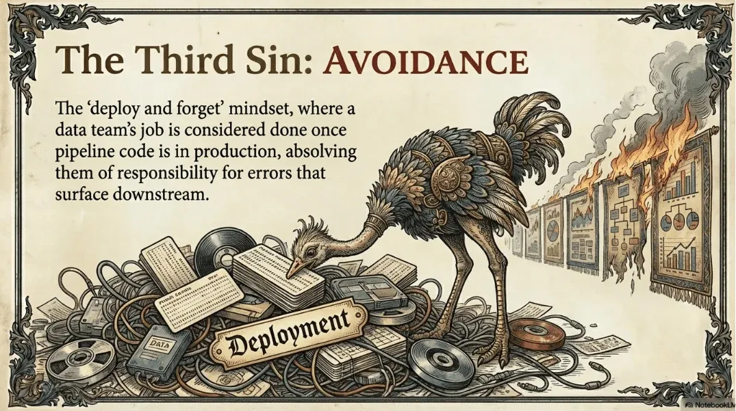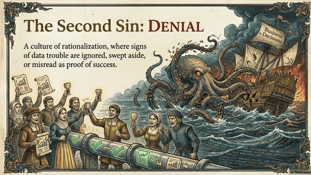 If the mechanics (data engineers) are afraid to open the hood because they might be blamed for what they find (Shame), or if they ignore a rattling noise because “the radio still works” (Denial), the car will eventually break down on the highway. If they believe their job ends the moment the car leaves the garage (Avoidance) or refuse to perform maintenance because no one applauds an oil change (Laziness), the engine will fail. The Seven Sins are the bad habits of the mechanics that guarantee the car will crash, regardless of how expensive or well-designed the vehicle originally was.