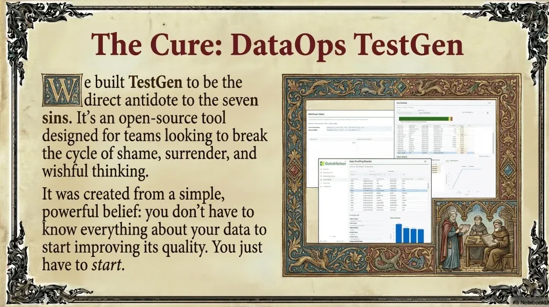 DataKitchen’s DataOps TestGen is explicitly designed to counter the “Seven Deadly Sins of Data Quality” not just by fixing technical bugs, but by addressing the behavioral and cultural root causes of these sins. By automating the heavy lifting of testing and profiling, it removes the barriers that allow these dysfunctions to thrive.