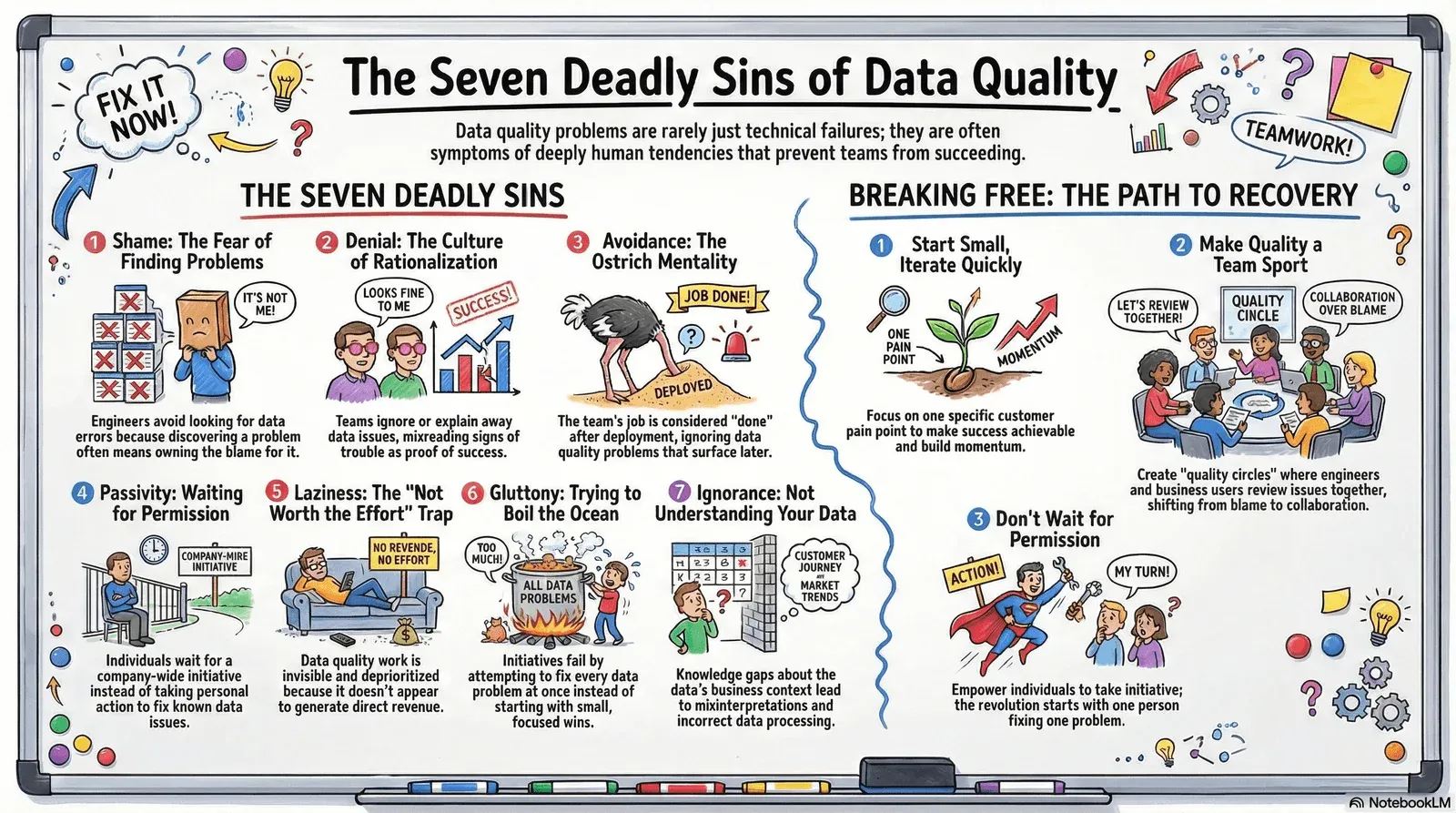 Understanding these sins is critical because recognition is the first step toward recovery. These behaviors explain why, despite the availability of tools and methodologies, data quality remains a persistent struggle for many organizations.
