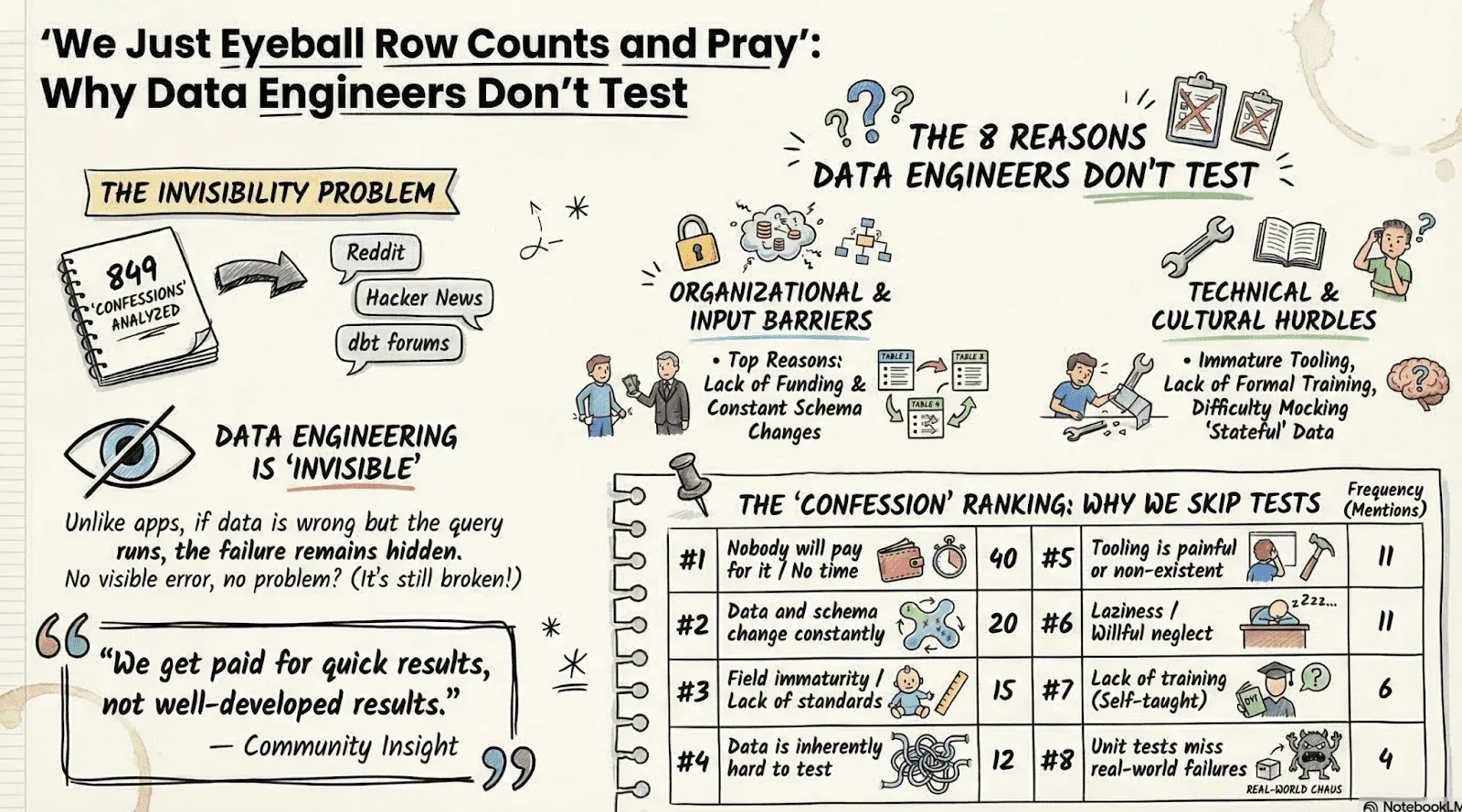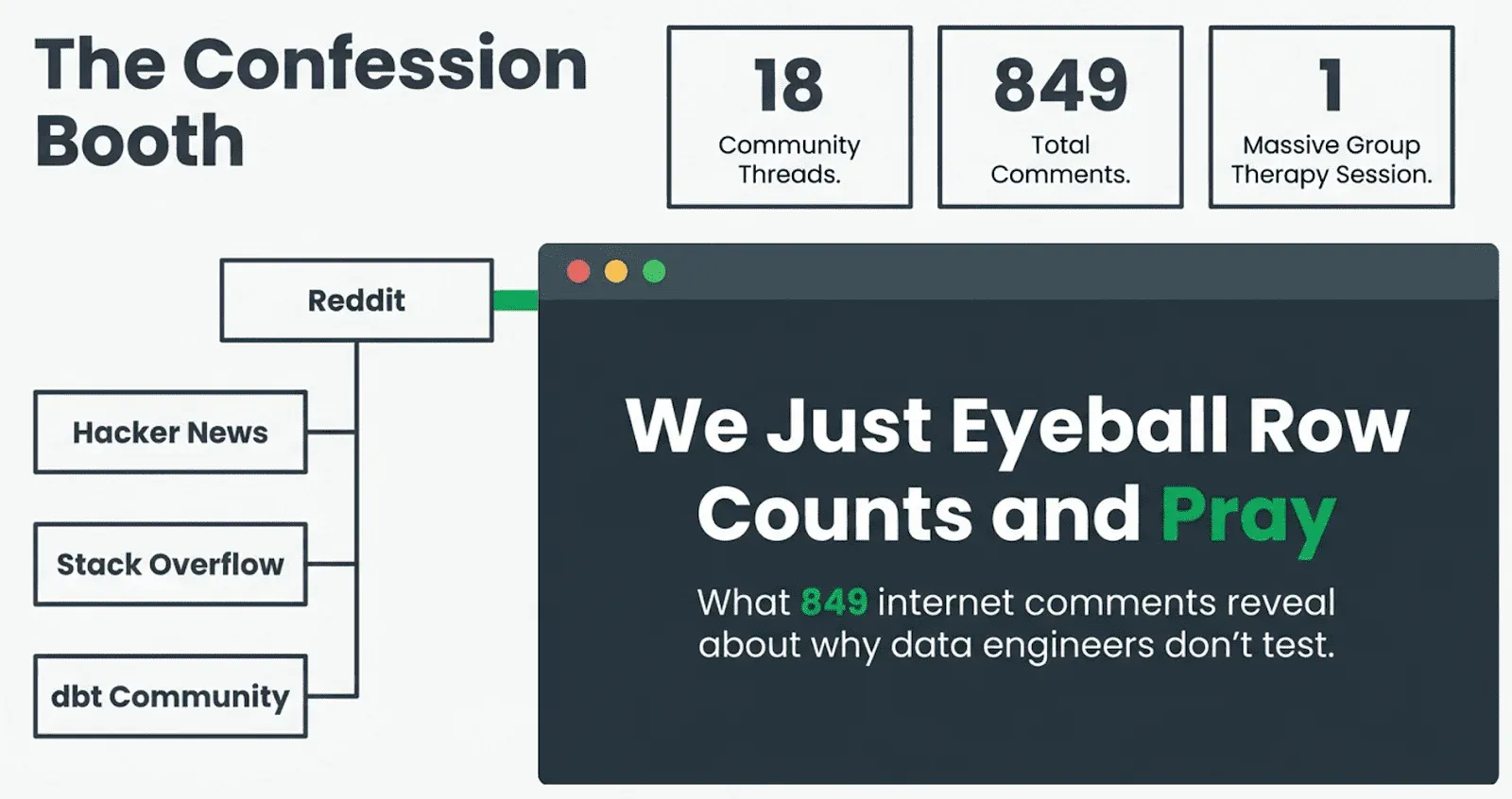 TL;DR: We read 849 comments across 18 community threads on Reddit, Hacker News, Stack Overflow, and the dbt Community Forum. The #1 reason data engineers don’t test: nobody gives them the time. The #2 reason: the data changes faster than the tests can keep up. Here’s the full breakdown, in their own words.