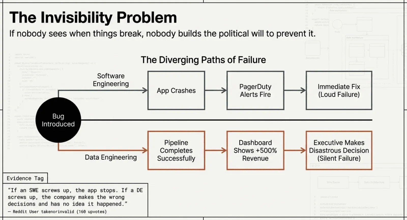 The same commenter articulated what might be the single most important insight in all eighteen threads: “Data Engineering is invisible. If a software engineer screws up, the app stops working, and everybody knows it. If a data engineer screws up, the company makes the wrong decisions and has no idea it happened.”