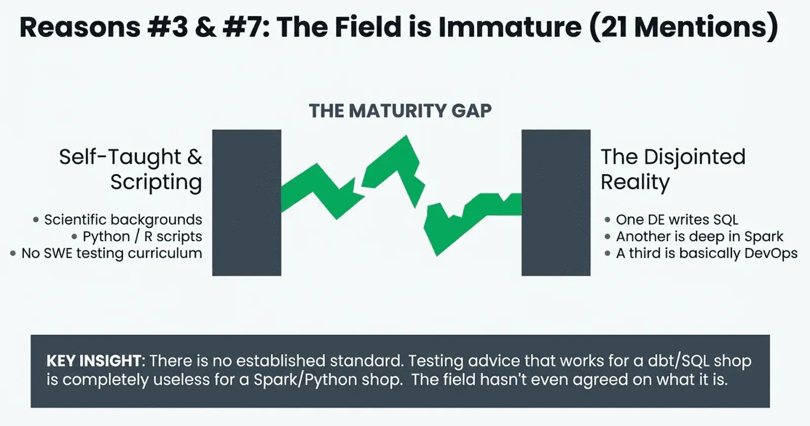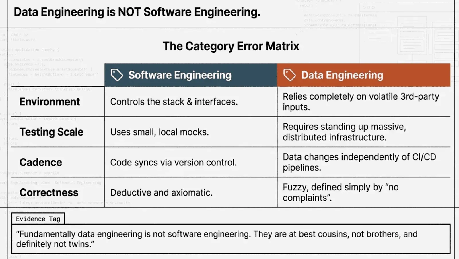 Before we get into the ranked reasons, it helps to understand a point the community made forcefully across every thread: data engineering is simply not software engineering, and trying to port SWE testing practices directly into the data world is a category error.