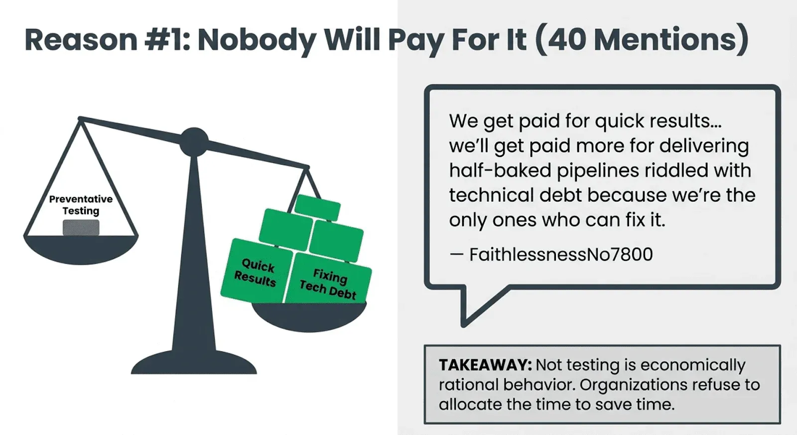 - Nobody pays for it / no time (40 mentions). The runaway winner, showing up in nearly every high-engagement thread. It was not even close. When data engineers explain why they do not test, the answer most often given is not technical. It is organizational. They are not given the time, the budget, or the incentive.