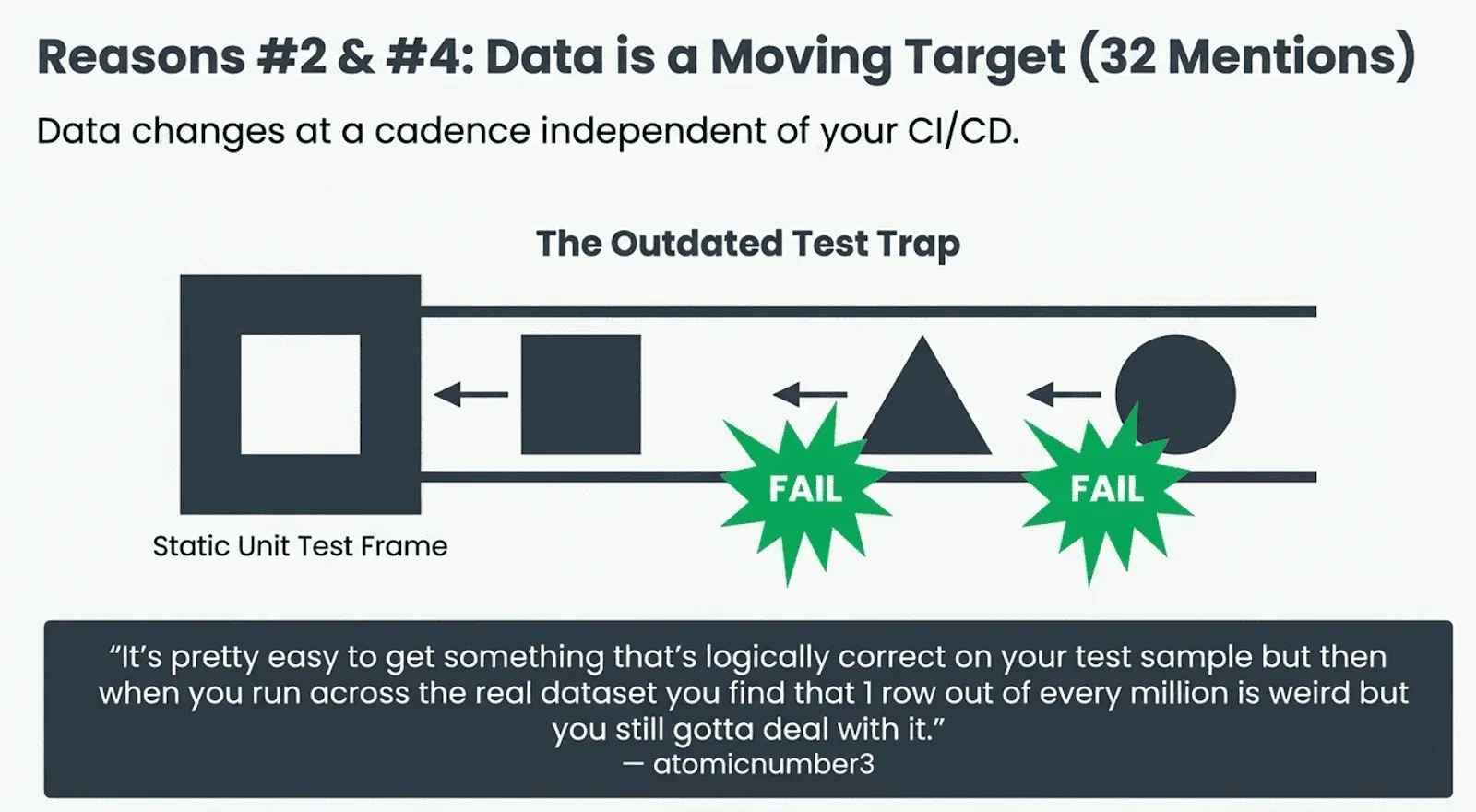#2. Data and schema change constantly (20 mentions). The “we don’t control the inputs” problem. Several commenters pointed out that the source data itself is a moving target. NaturalBornLucker described the cycle: “there are some unit tests that previous team did but they are already outdated and obsolete and I disabled some of them. It’s like there’s some fine logic and thought in them but all that work is entirely unnecessary. And if one of table schemas is changed they fail and you need new test DataFrames.”