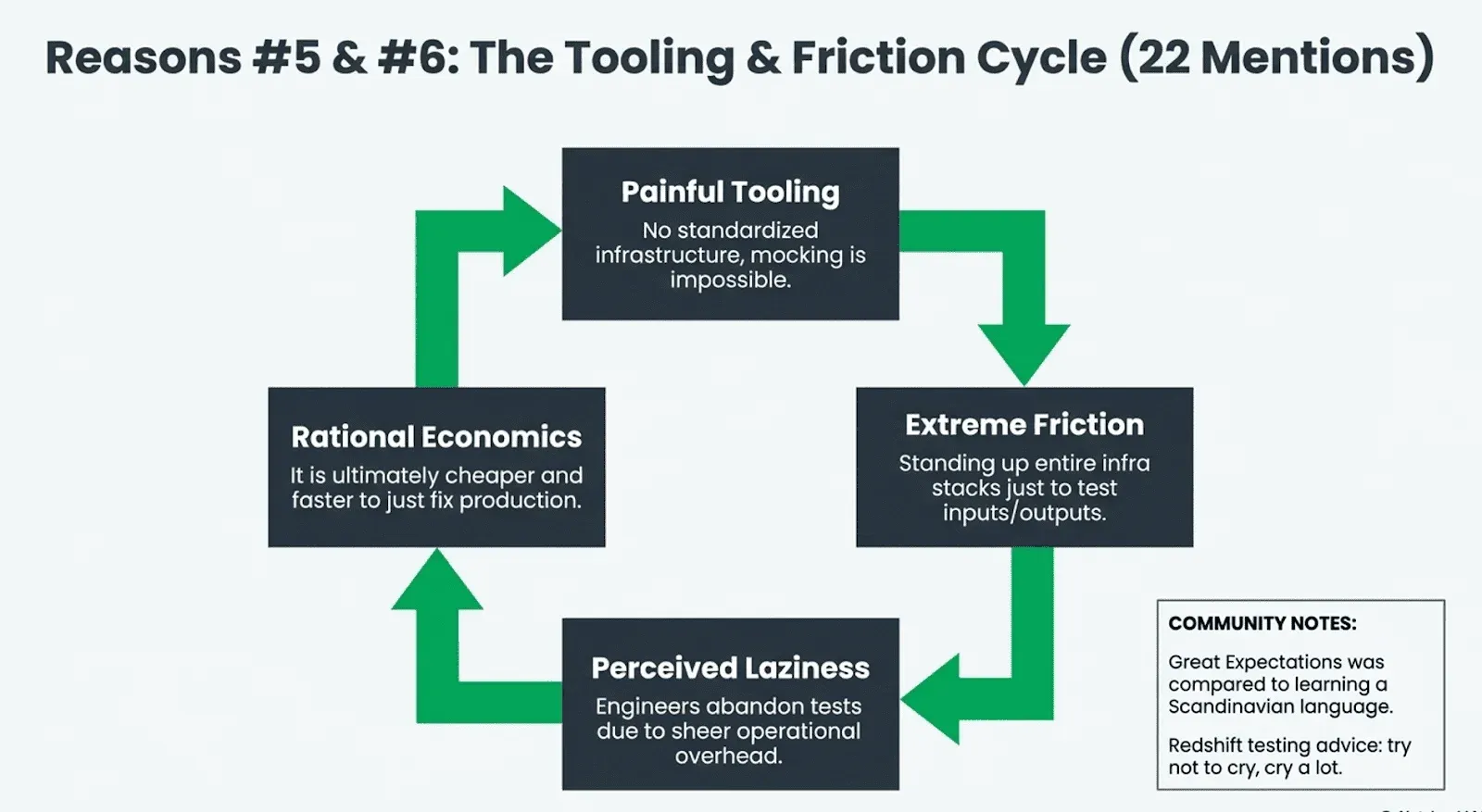 There are more reasons in ‘We Got Roasted On Reddit For Asking ‘Why Data Engineers Don’t Test?’ … how does it compare to the eight reasons from our blog post?