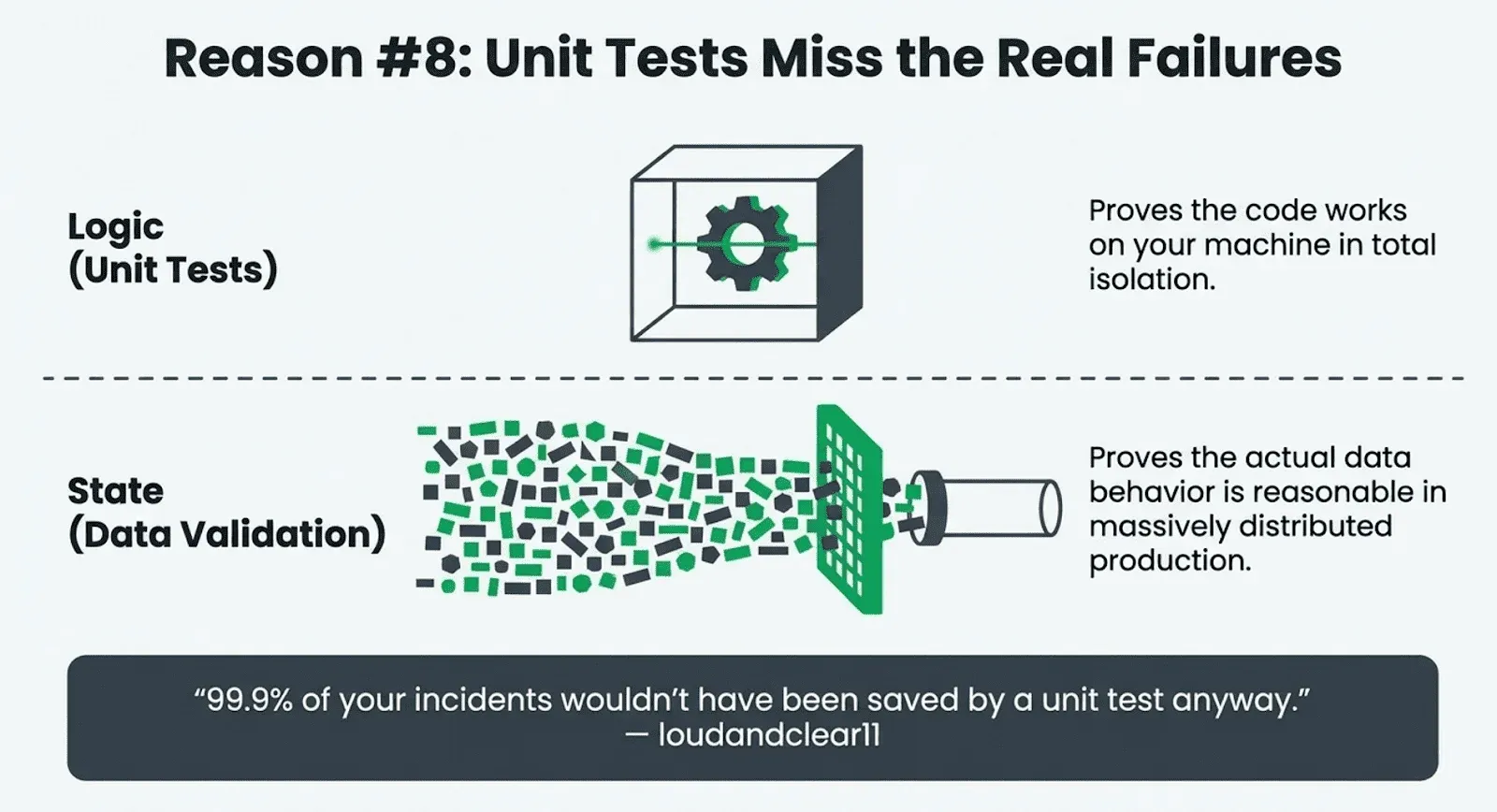 #8. Unit tests do not catch the failures that actually hurt (4 mentions). This was the least common reason but arguably the most sophisticated. Jumpy-Possibility754 wrote: “unit tests help but they don’t catch the kinds of failures that actually break things in production. What tends to matter more is data validation layers, pipeline observability, and the ability to replay parts of the flow when something fails mid-chain.”