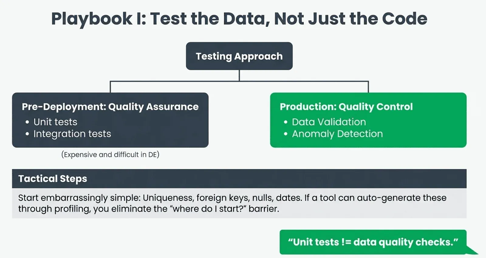 Test the data, not just the code, and start embarrassingly simple. This was the closest thing to consensus across all eighteen threads. User EarthGoddessDude stated it crisply: “Unit tests != data quality checks.” Unit tests verify that your code does what you intended. Data quality checks verify that the data you received is what you expected. In data engineering, the second category catches far more real-world failures than the first.
