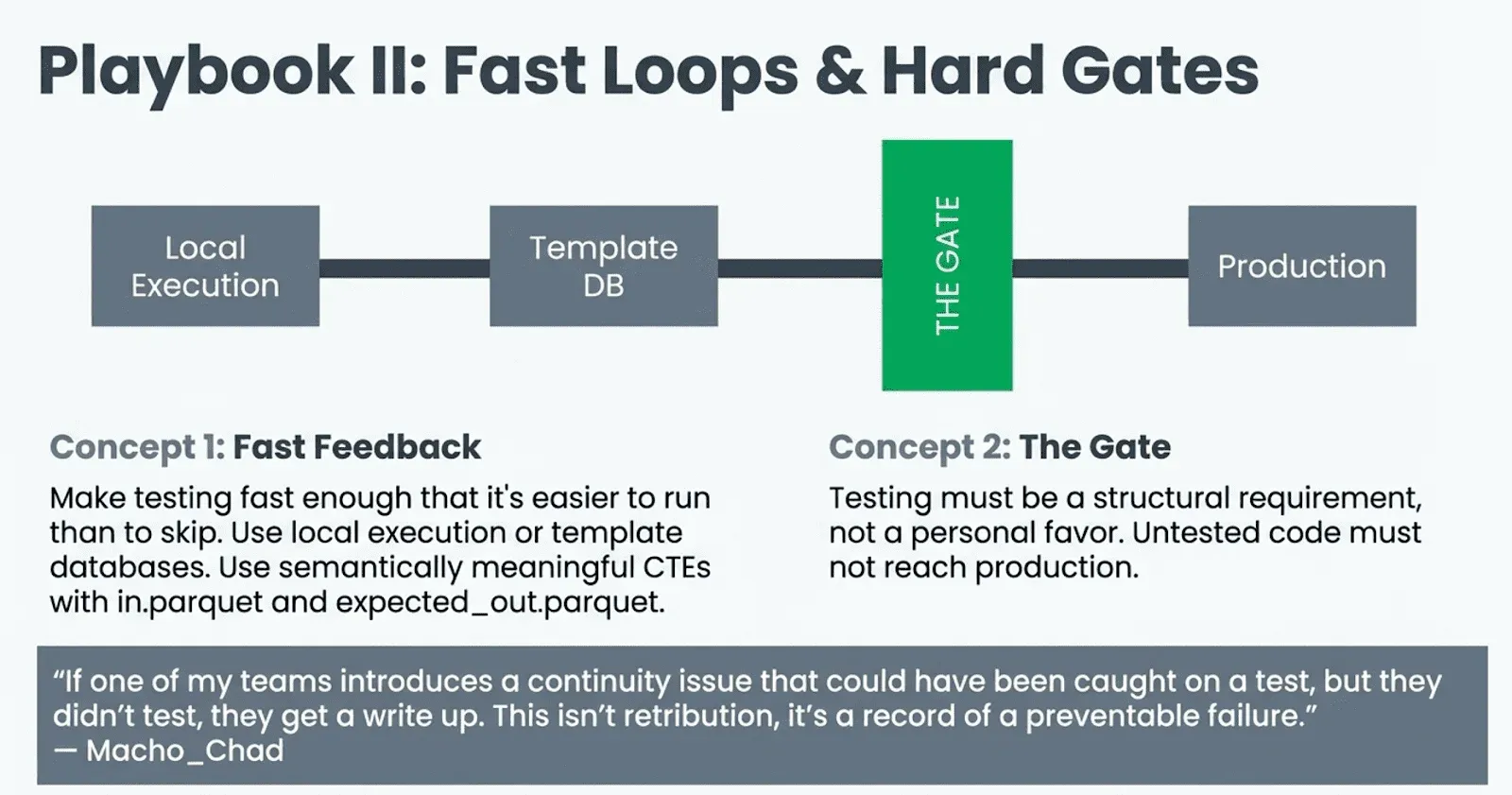 Make the feedback loop faster and make testing a gate. On Hacker News, the top-voted advice from RobinL was: “Try and write any complex SQL as a series of semantically meaningful CTEs. Test each part of the CTE pipeline with an in.parquet and an expected_out.parquet.” The approach uses DuckDB for fast local execution. MonochromeDinosaur prescribed a complementary pattern: “write pure functions, separate I/O from transformations and do unit tests with in-line fixtures using data structures native to the tool you’re using. This is easy because you control the intermediate schemas and state.” User feike on HN described getting 82 integration tests to run in 6.9 seconds using Postgres template databases, creating a fresh database for each test from a template snapshot. The common thread: make testing fast enough that it is easier to run than to skip.