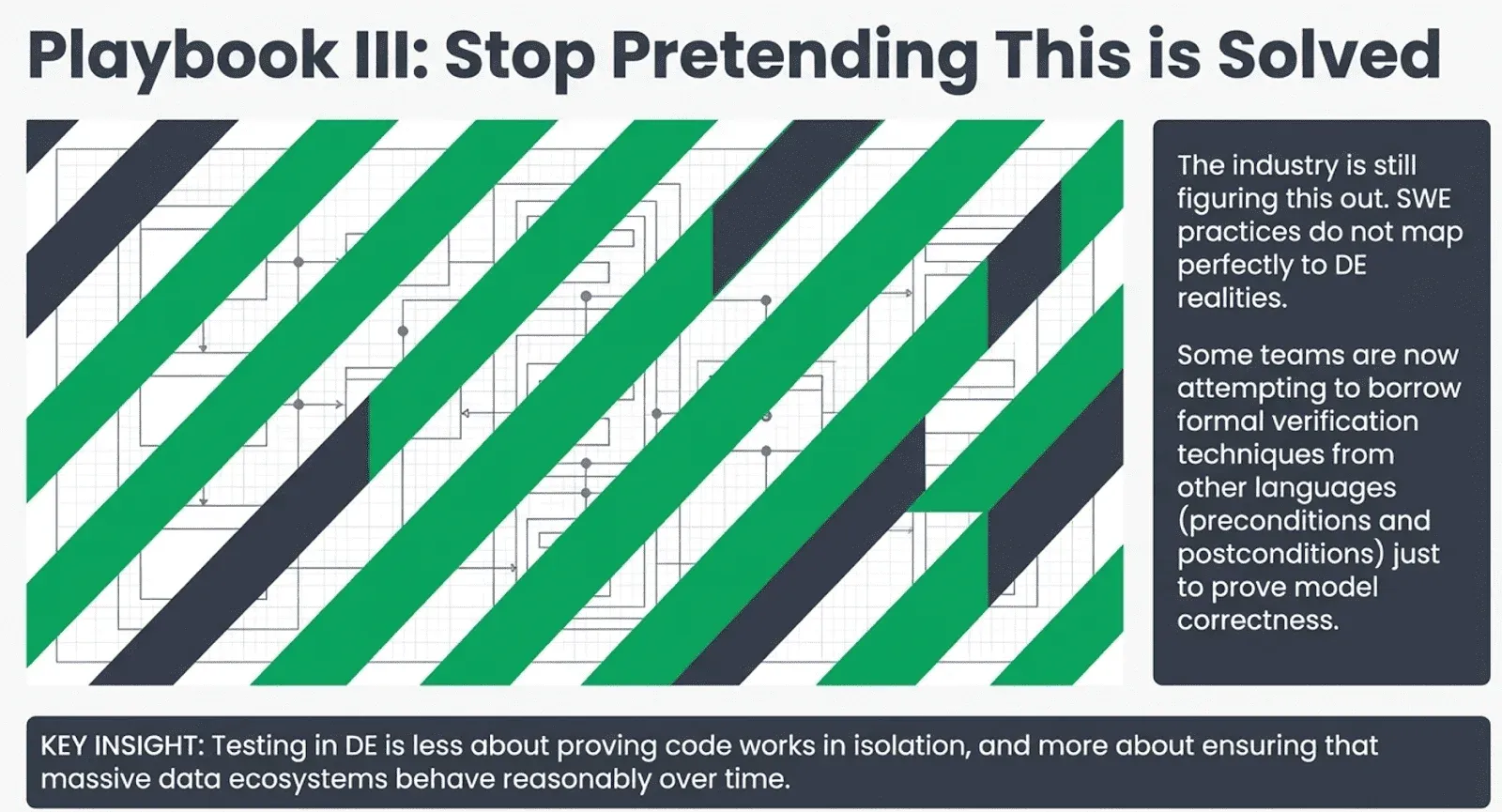 Stop pretending this is a solved problem. On the dbt Community Forum, the “State of Testing in dbt” thread acknowledged openly that the field is still figuring out what testing should look like for data transformations. One contributor proposed borrowing a formal verification technique from another programming language: define preconditions and postconditions for each model, and prove correctness by showing that any run that starts in a state where the preconditions hold will end in a state where the postconditions hold. The fact that someone felt the need to reach that far outside the data ecosystem for a testing idea tells you how unsettled the question still is.