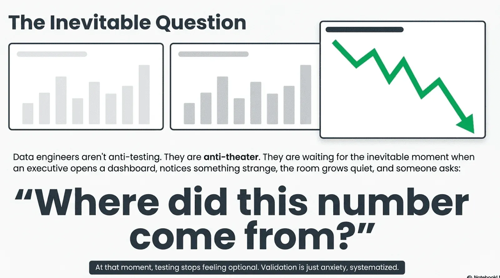 Maybe that is the real answer. The data engineers who test are not smarter or more disciplined. They are just more nervous. And sooner or later, every organization confronts the same moment that turns the nervous ones into the essential ones. An executive opens a dashboard and notices something strange. The numbers look wrong. The room grows quiet.